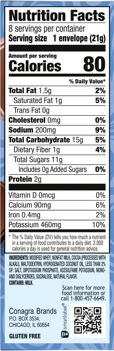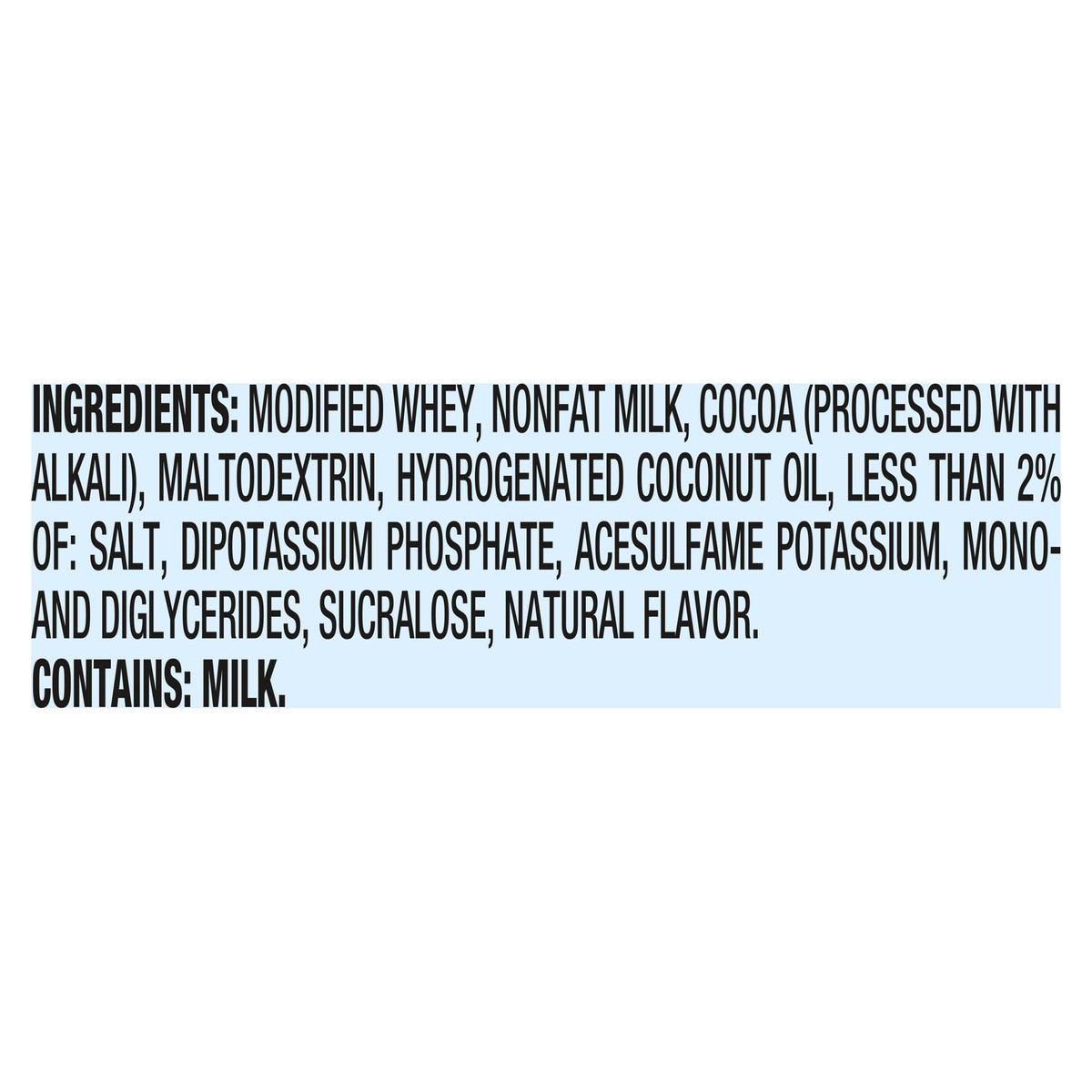 Modified Whey, Nonfat Milk, Cocoa (Processed with Alkali), Maltodextrin, Hydrogenated Coconut Oil, Less than 2% of: Salt, Dipotassium Phosphate, Acesulfame Potassium, Mono- and Diglycerides, Sucralose…