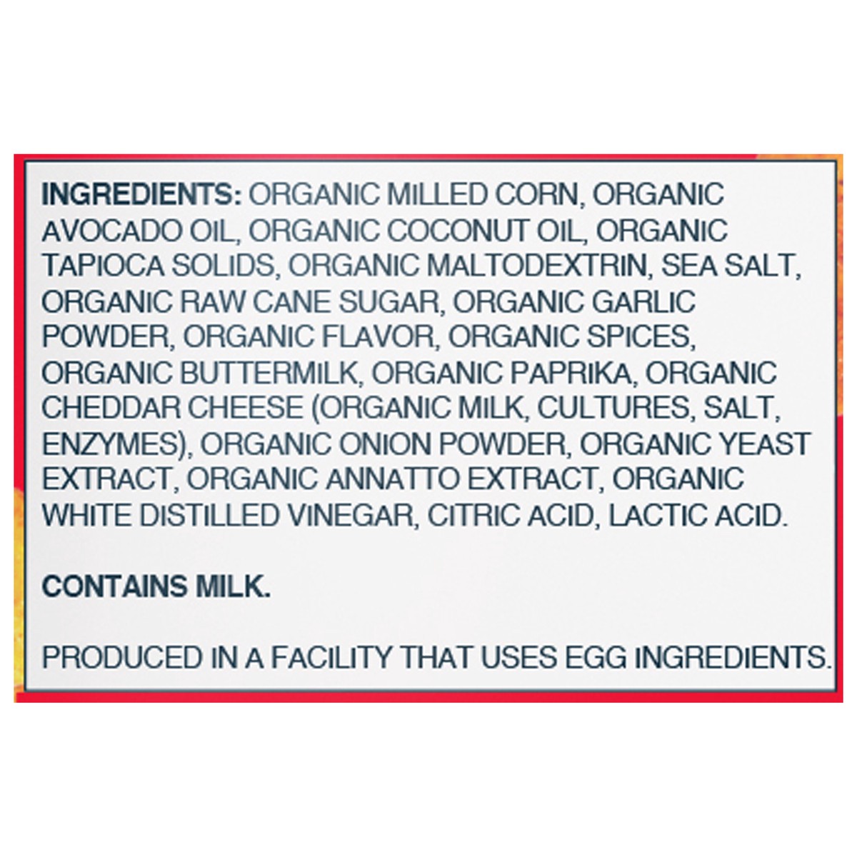Organic Milled Corn, Organic Avocado Oil, Organic Coconut Oil, Organic Tapioca Solids, Organic Maltodextrin, Sea Salt, Organic Raw Cane Sugar, Organic Garlic Powder, Organic Flavor, Organic Spices, Or…