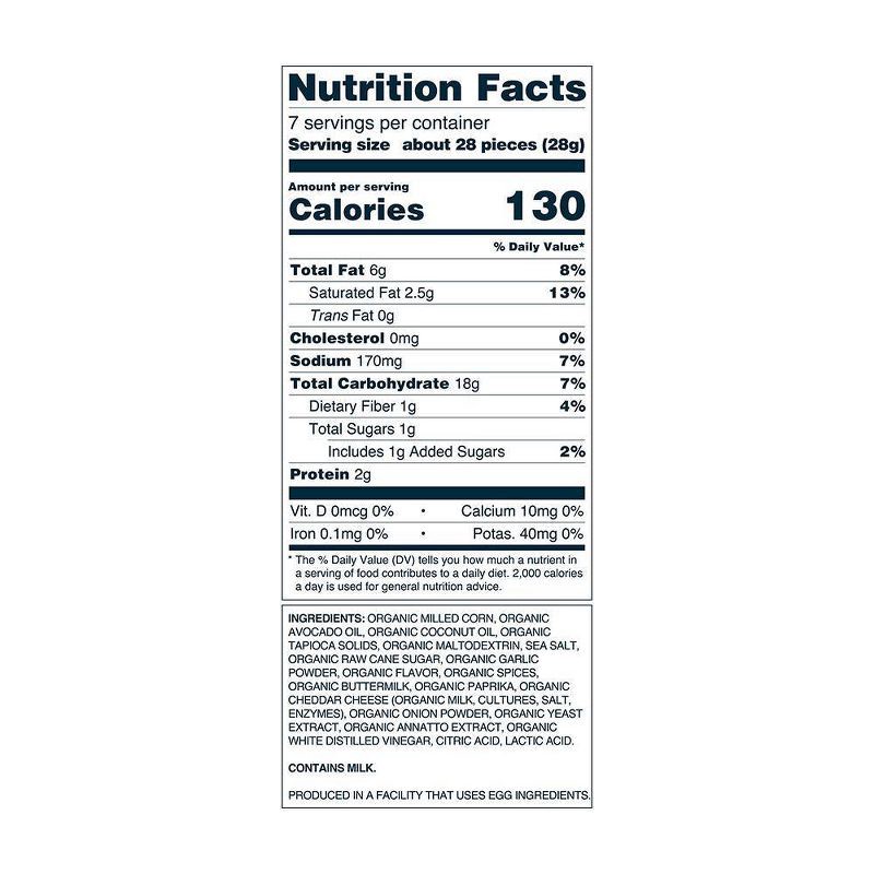 ingredients: organic milled corn, organic avocado oil, organic tapioca solids, organic maltodextrin, sea salt, organic raw cane sugar, organic garlic powder, organic flavor, organic spices, organic bu…