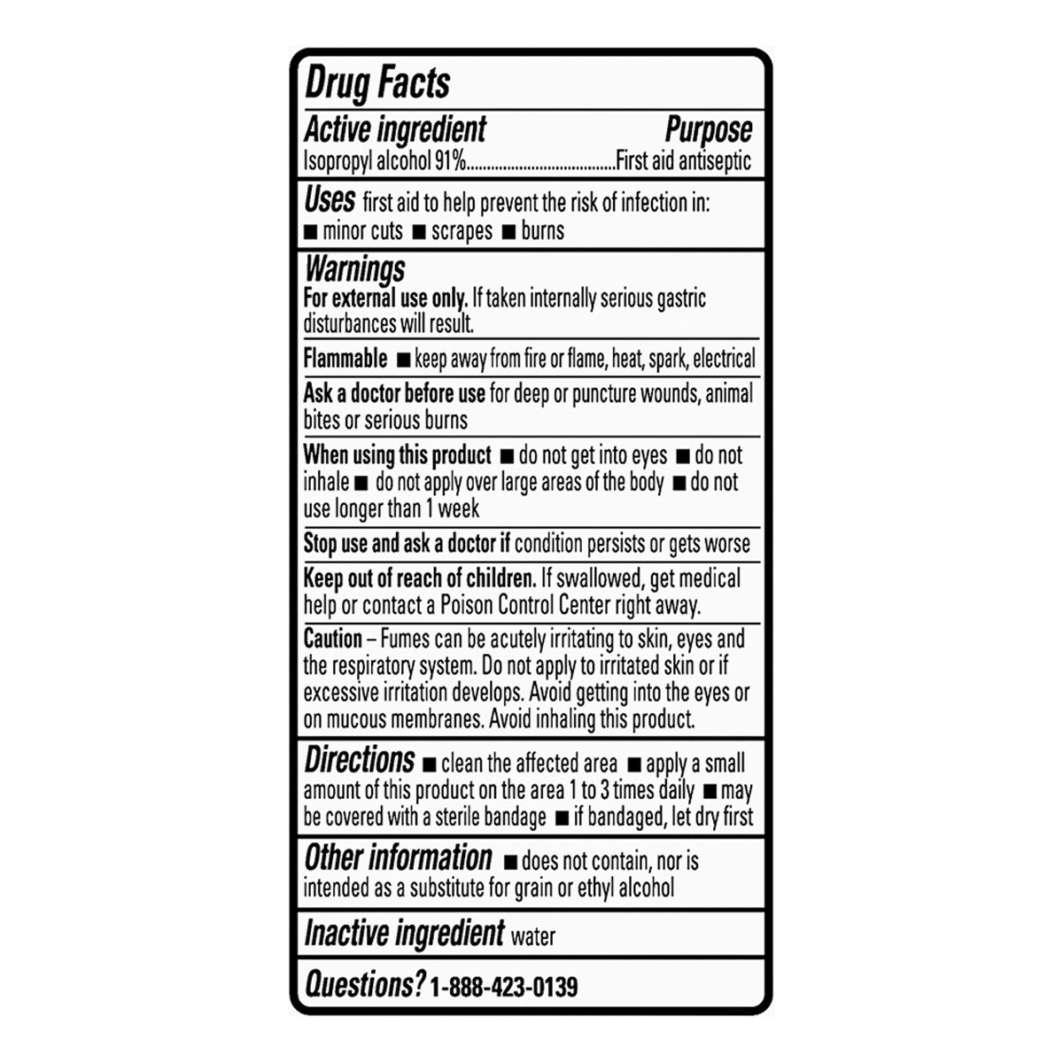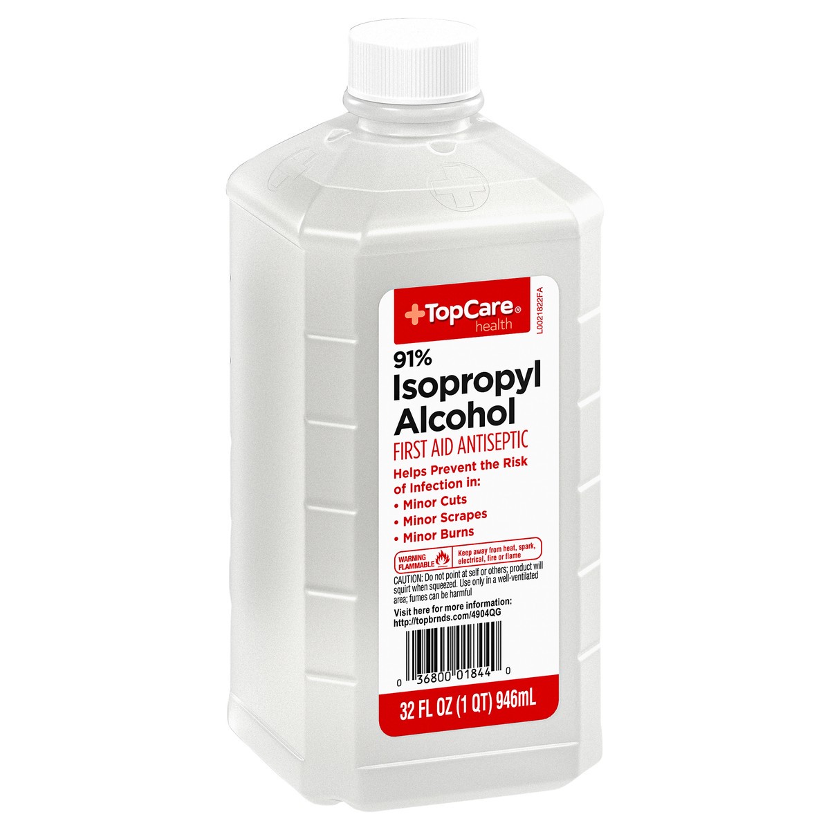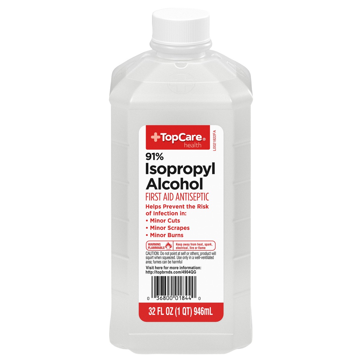 TopCare Health 91% Isopropyl Alcohol ā First aid antiseptic used to help prevent infection in minor cuts, scrapes, and burns. Contains 32 FL OZ (946 mL). Includes safety warnings and usage cautions. Vā¦