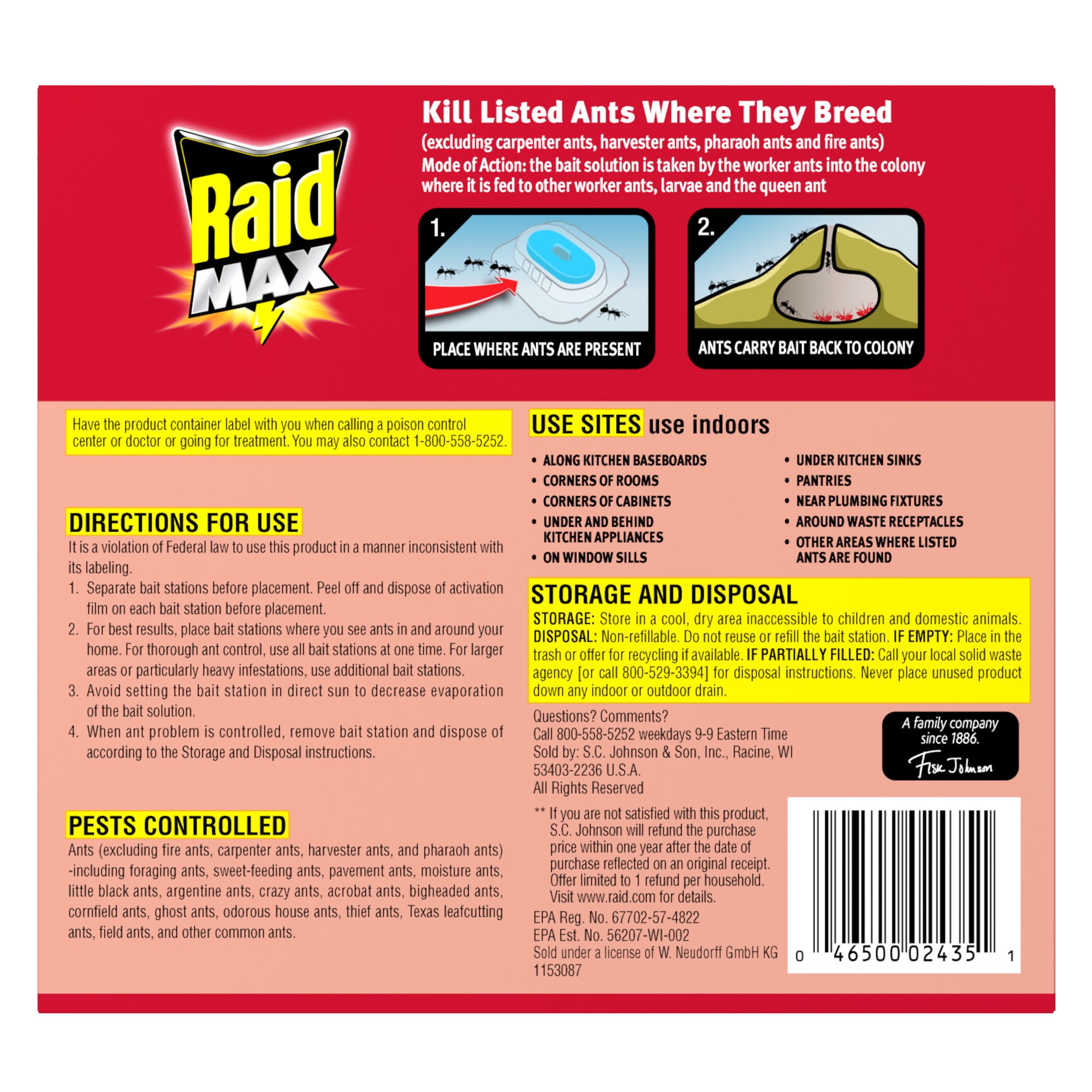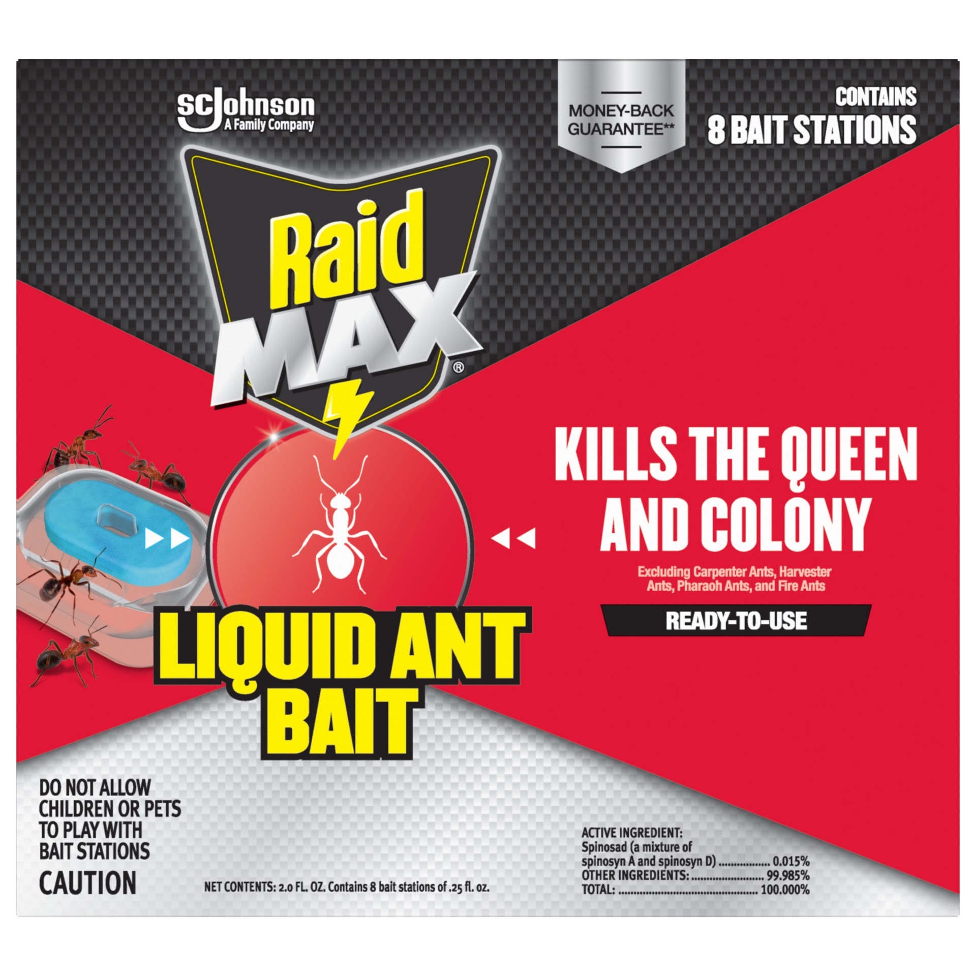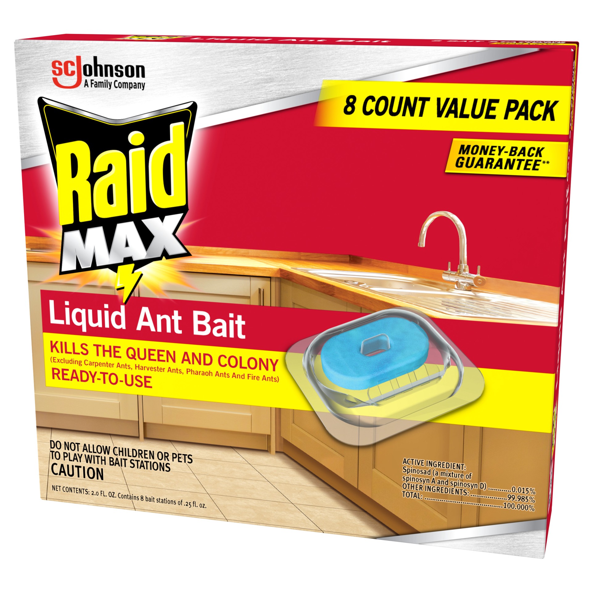 Raid MAX Liquid Ant Bait quickly attracts & kills ants where they breed. The pre-filled liquid ant bait is convenient and ready-to-use. To use, place the Raid MAX Liquid where ants are present. The ba…