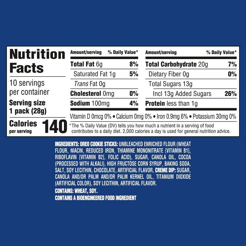 OREO COOKIE STICKS: UNBLEACHED ENRICHED FLOUR (WHEAT FLOUR, NIACIN, REDUCED IRON, THIAMINE MONONITRATE [VITAMIN B1], RIBOFLAVIN [VITAMIN B2], FOLIC ACID), SUGAR, CANOLA OIL, COCOA (PROCESSED WITH ALKA…