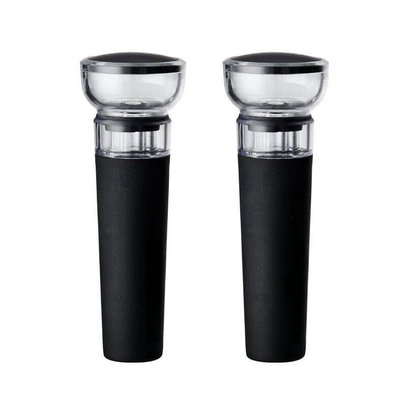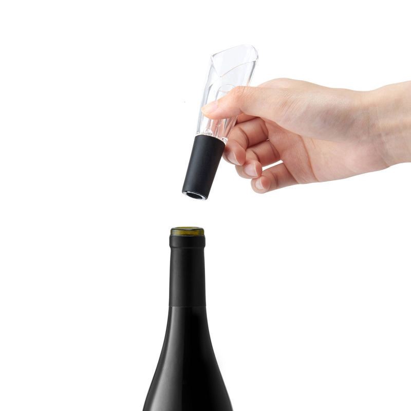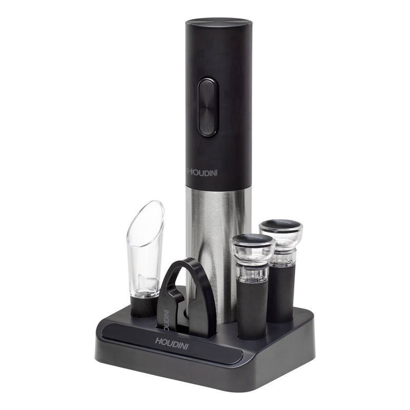 Houdini 6 Piece Corkscrew Set includes a battery electric corkscrew, aerating pourer, foil cutter, 2 wine preserving stoppers, and a base. Electric corkscrew opens wine with the touch of a button, wor…