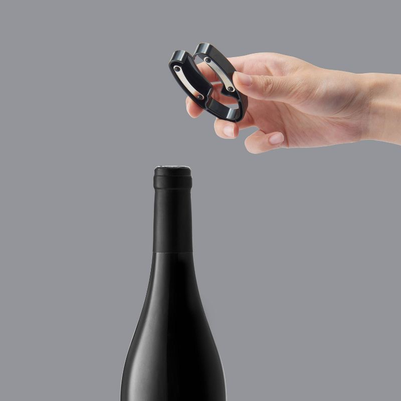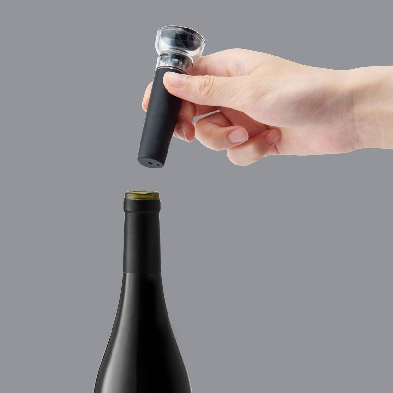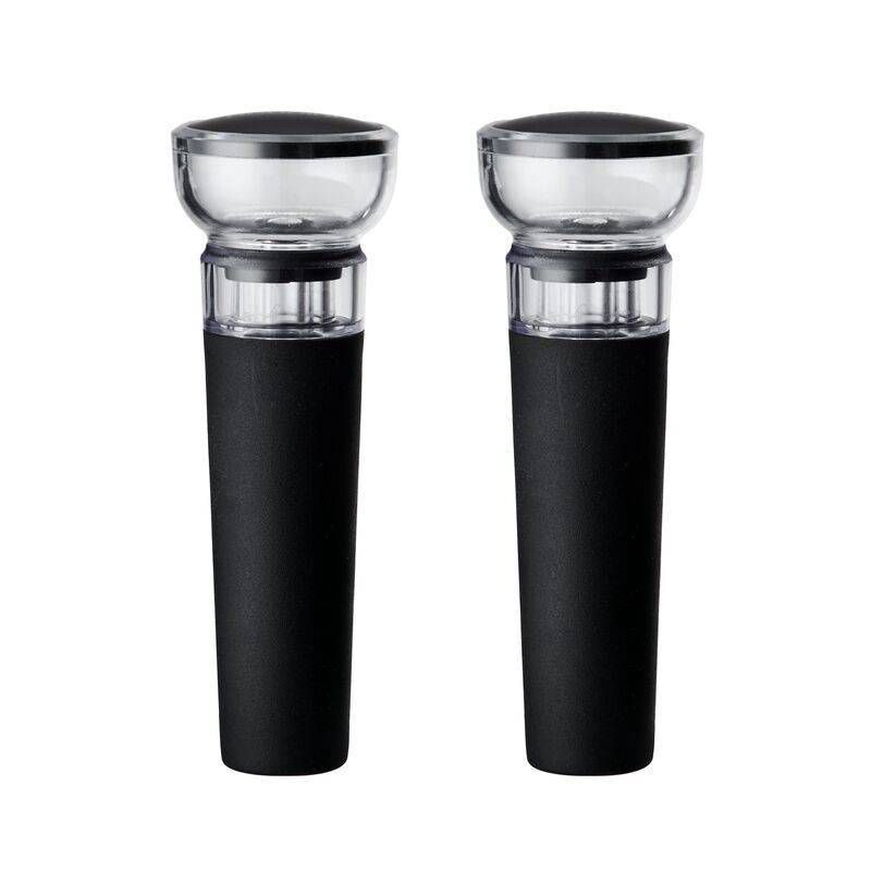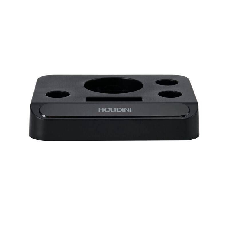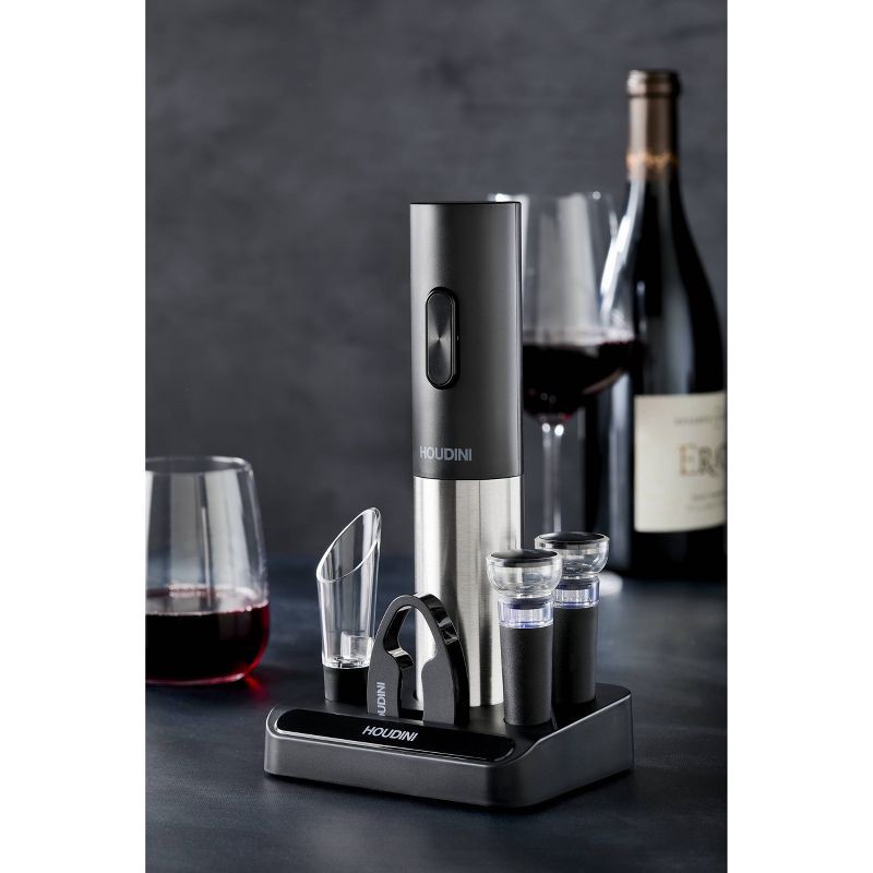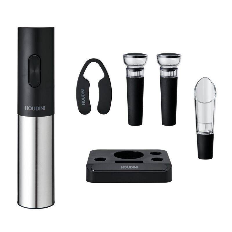 Houdini 6 Piece Corkscrew Set includes a battery electric corkscrew, aerating pourer, foil cutter, 2 wine preserving stoppers, and a base. Electric corkscrew opens wine with the touch of a button, wor…