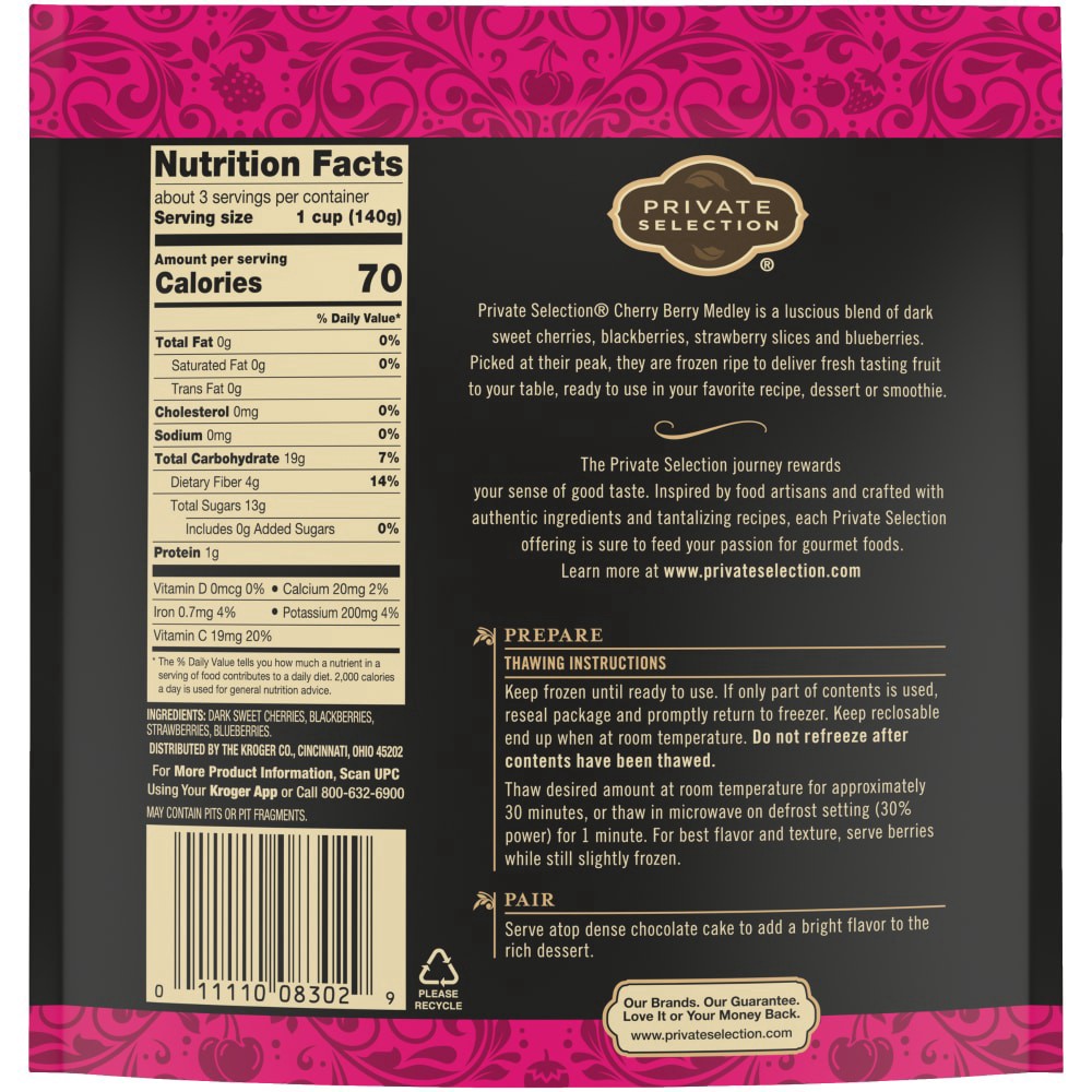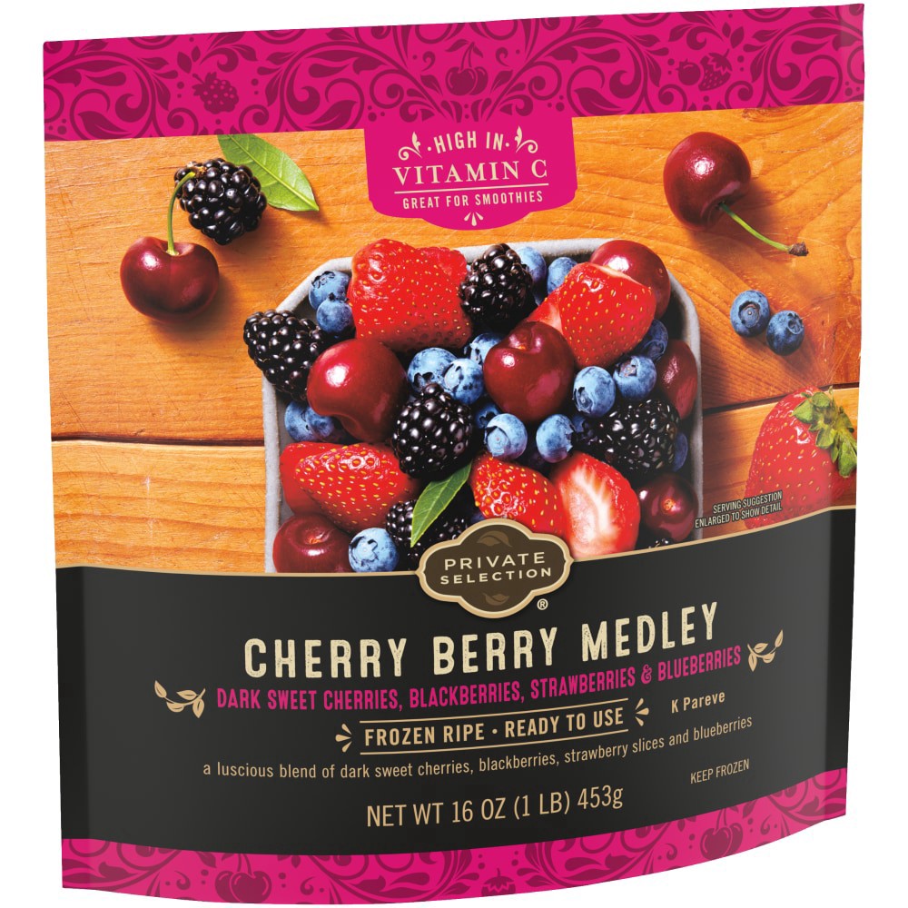 Private Selection® Cherry Berry Medley Frozen Fruit boasts a luscious blend of dark sweet cherries, blackberries, strawberry slices, and blueberries. Picked at their peak and frozen ripe, this fruit m…