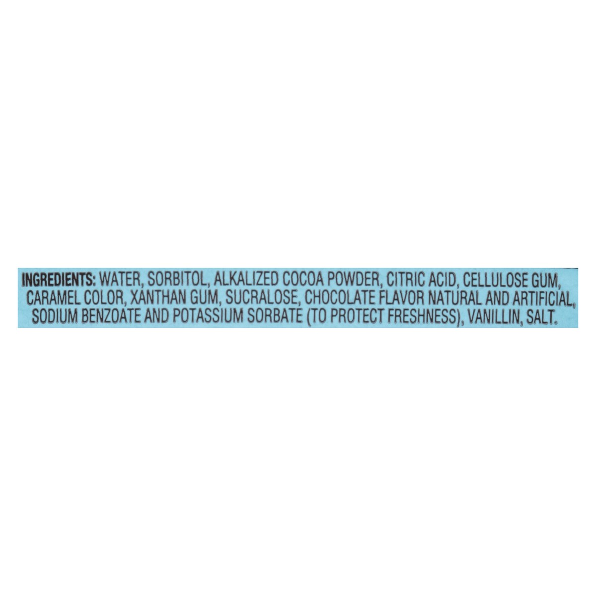 Water, Sorbitol, Alkalized Cocoa Powder, Citric Acid, Cellulose Gum, Caramel Color, Xanthan Gum, Sucralose, Chocolate Flavor Natural and Artificial, Sodium Benzoate and Potassium Sorbate (to Protect F…