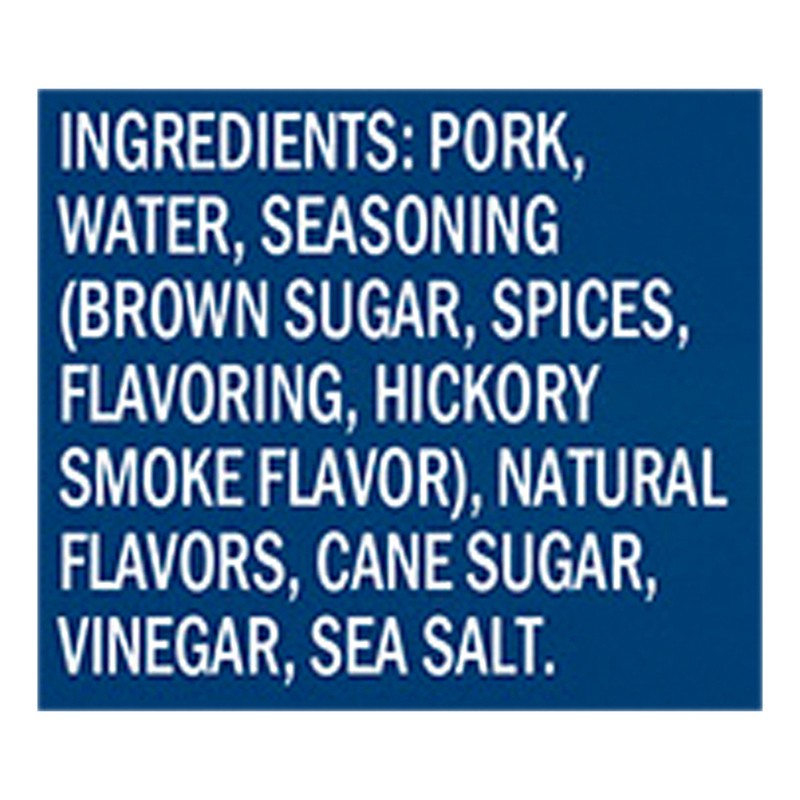 Pork, Water, Seasoning (Brown Sugar, Spices, Dehydrated Onion, Natural Hickory Smoke Flavor), Natural Flavors, Sea Salt, Organic Sugar.