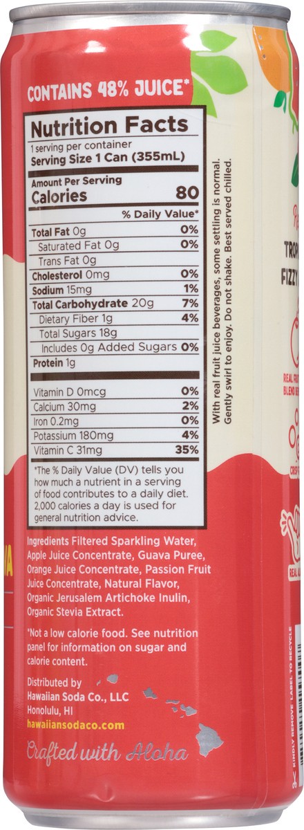 Filtered Sparkling Water, Apple Juice Concentrate, Guava Puree, Orange Juice Concentrate, Passion Fruit Juice Concentrate, Natural Flavor, Organic Jerusalem Artichoke Inulin, Organic Stevia Extract.