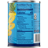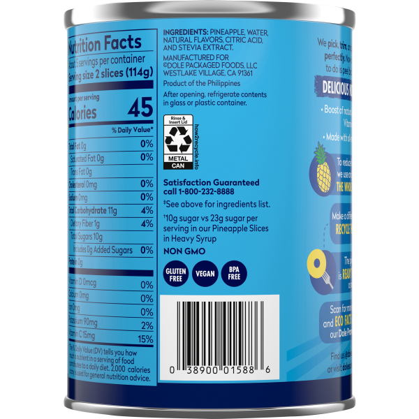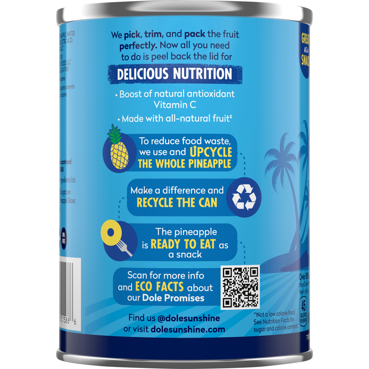 Dole No Sugar Added Pineapple Slices in Water are packed in an easy-to-open can, keeping the cut pineapple fresh and ready to be enjoyed at any time. Rich in Vitamin C and with over 50% less sugar tha…