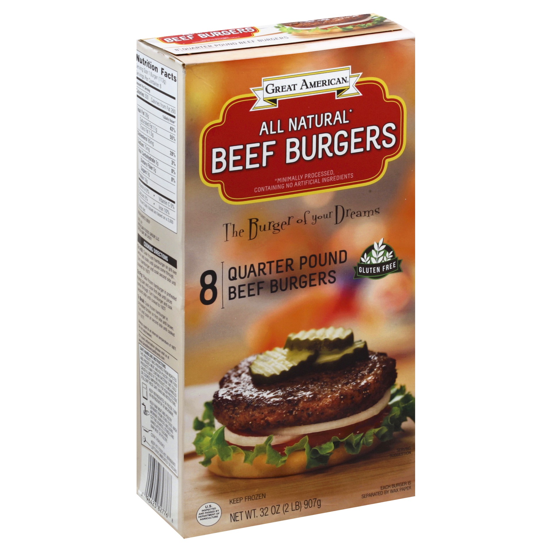 All natural (Minimally processed, containing no artificial ingredients). The burger of your dreams. Gluten free. US inspected and passed by Department of Agriculture. Each burger is separated by wax p…