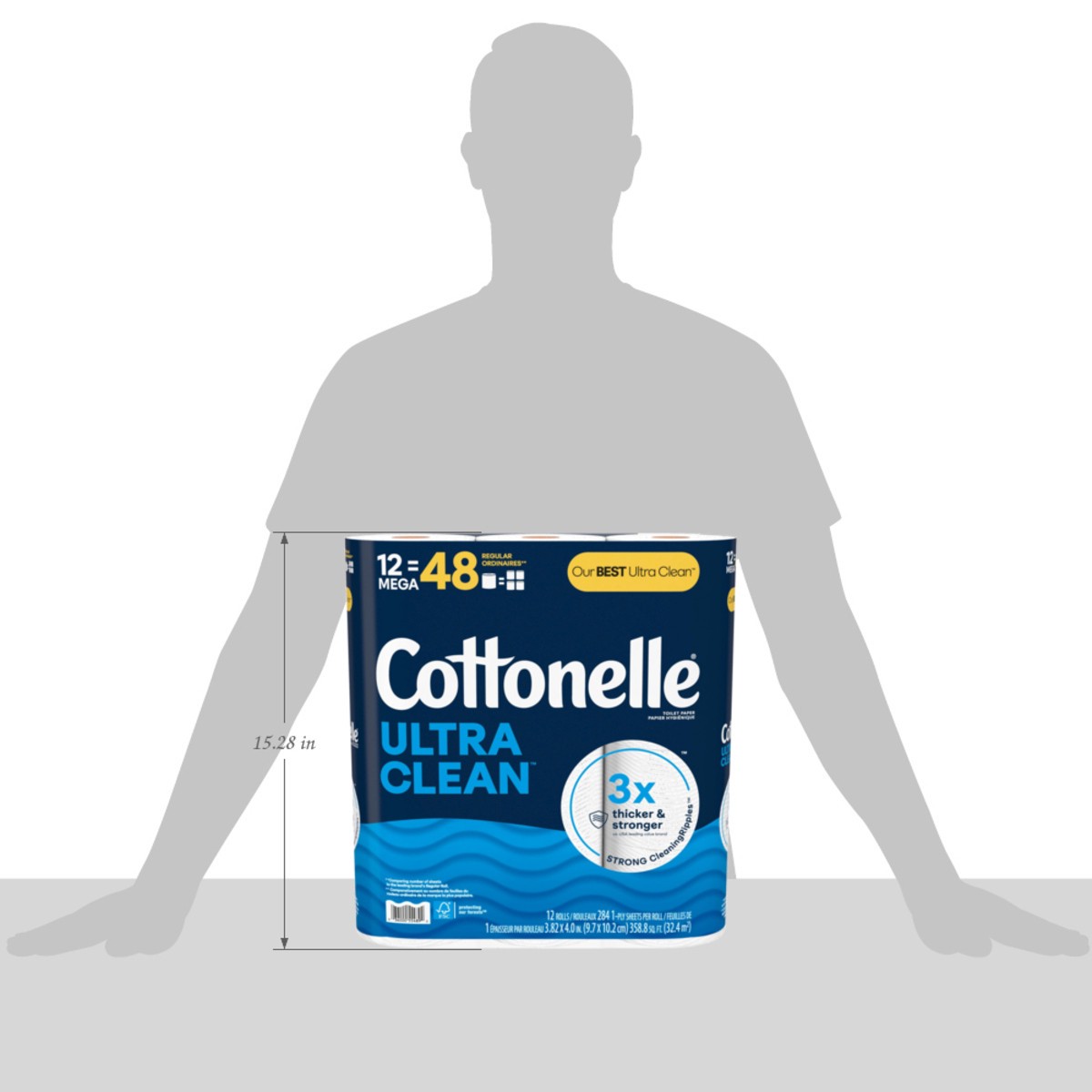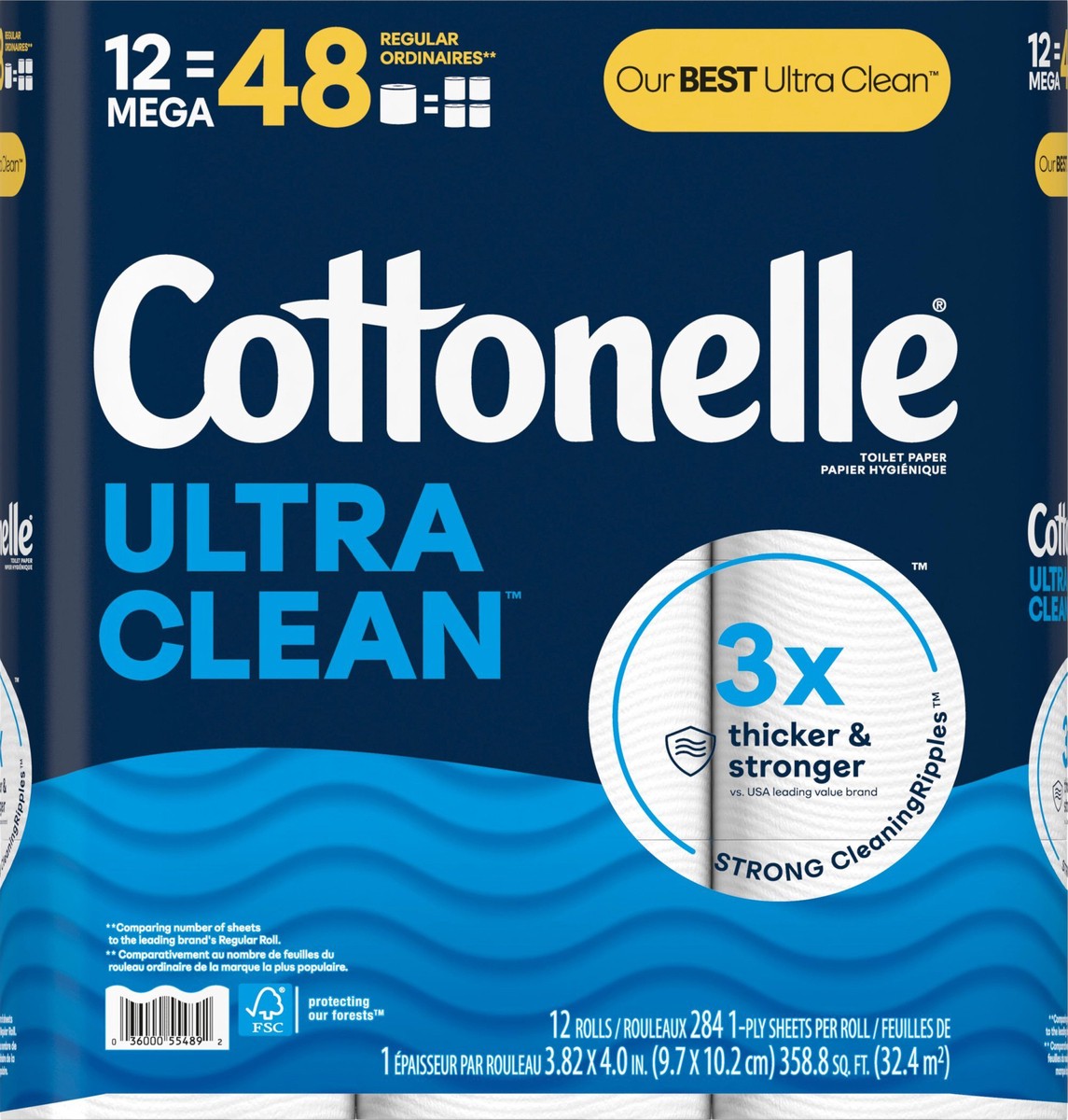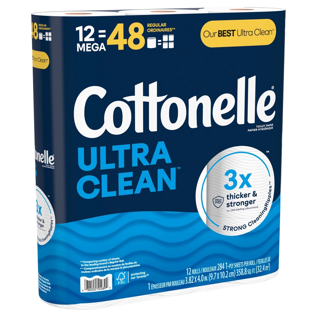 - WHAT'S INCLUDED — This toilet paper pack includes 12 Mega Rolls of Cottonelle Ultra Clean 1-Ply Toilet Paper with 284 sheets per roll (358.80 square feet total); packaging may vary