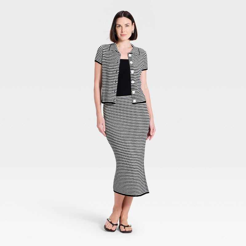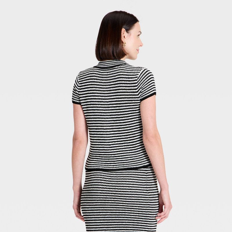 Women's Button-Up Collar Short Sleeve Sweater Top - A New Day™ Black/Cream Striped M
