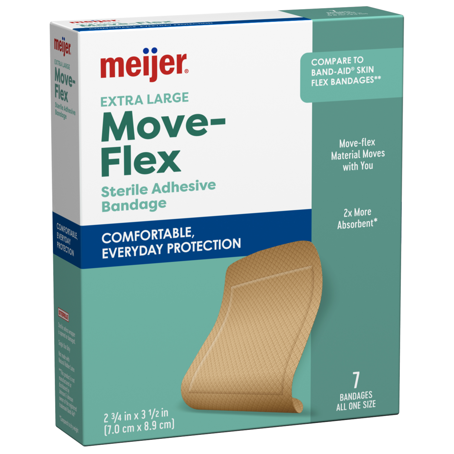 Meijer Move-Flex Extra Large Adhesive Bandages are designed for comfort and flexibility. They're made with eight times more flexibility that moves with you, so the bandage stays in place throughout th…