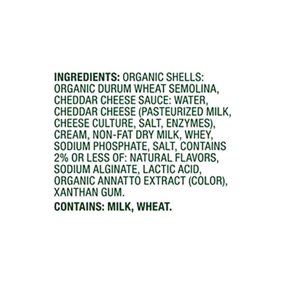 Organic Shells: Organic Durum Wheat Semolina, Cheddar Cheese Sauce: Water, Cheddar Cheese (Pasteurized Milk, Cheese Culture, Salt, Enzymes), Cream, Non-Fat Dry Milk, Whey, Sodium Phosphate, Salt, Cont…
