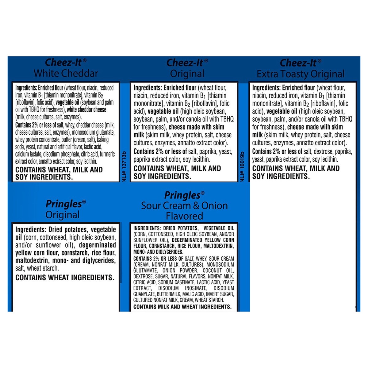 Cheez-it white cheddar: contains wheat, milk and soy ingredients.,pringles original: contains wheat ingredients.,pringles sour cream & onion flavored: contains milk and wheat ingredients.