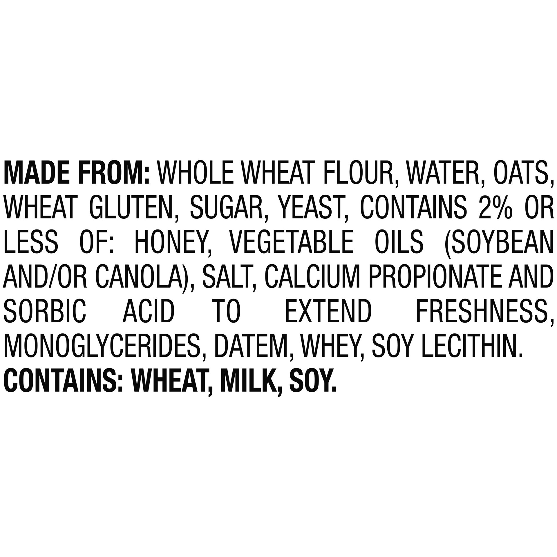 MADE FROM: WHOLE WHEAT FLOUR, WATER, OATS, WHEAT GLUTEN, SUGAR, YEAST, CONTAINS 2% OR LESS OF: HONEY, VEGETABLE OILS (SOYBEAN AND/OR CANOLA), SALT, CALCIUM PROPIONATE AND SORBIC ACID TO EXTEND FRESHNE…