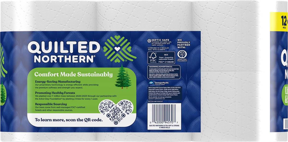 - Each pack contains 12 Mega Rolls of Quilted Northern Ultra Soft & Strong toilet paper.