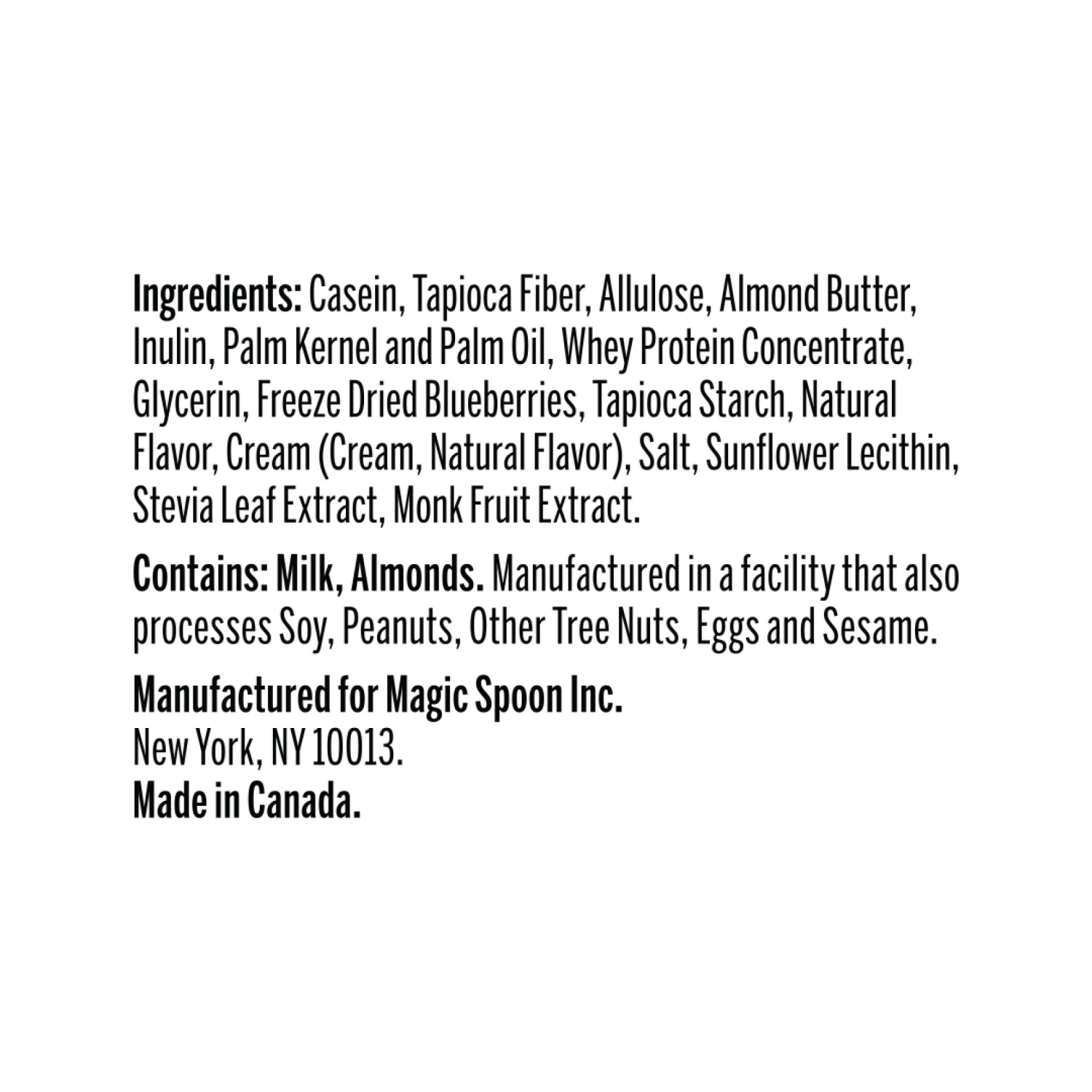 Casein, Allulose, Tapioca Fiber, Almond Butter, Inulin, Palm Kernel And Palm Oil, Whey Protein Concentrate, Glycerin, Blueberries, Tapioca Starch, Natural Flavor, Cream (Cream, Natural Flavor), Salt, …