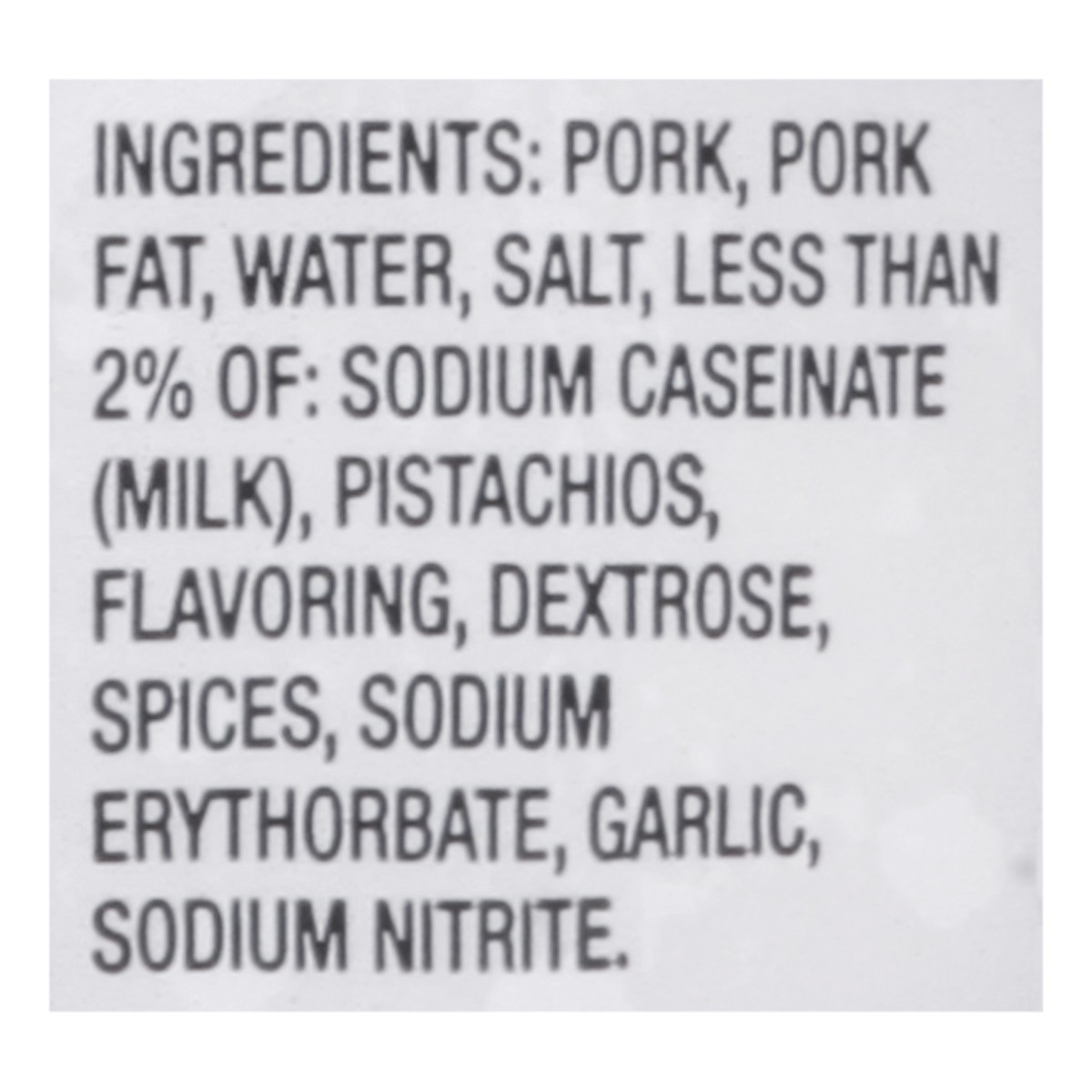 Pork, Pork Fat, Water, Salt, Less than 2% of: Sodium Caseinate (Milk), Pistachios, Flavoring, Dextrose, Spices, Sodium Erythorbate, Garlic, Sodium Nitrite.
