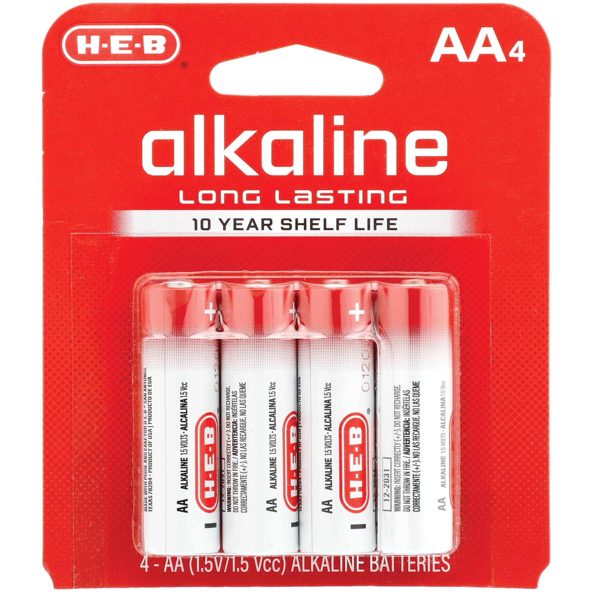 Our durable H-E-B AA batteries hold power when you need it most for all your everyday devices.• 4 count Alkaline 1.5V AA batteries• Long lasting• 10 year shelf life