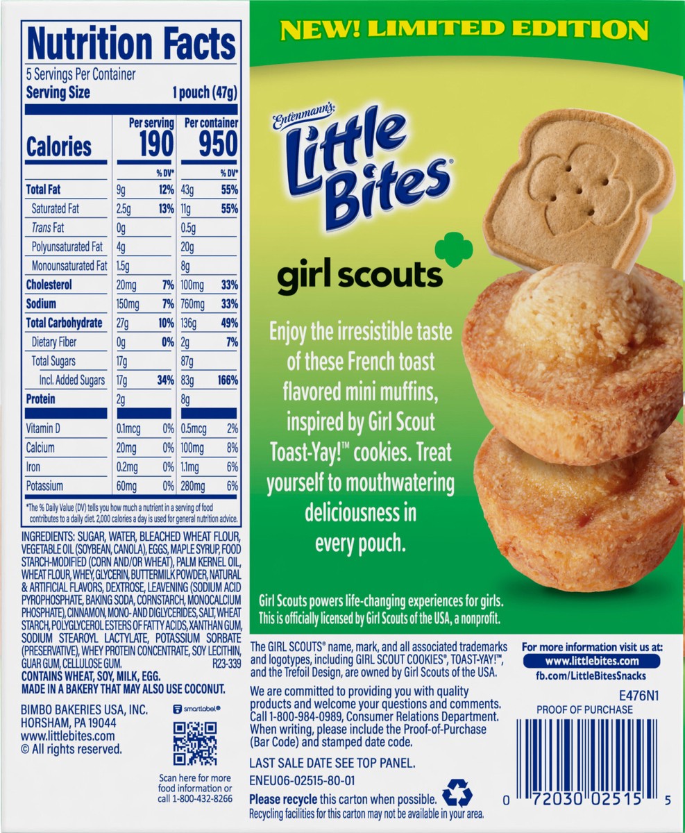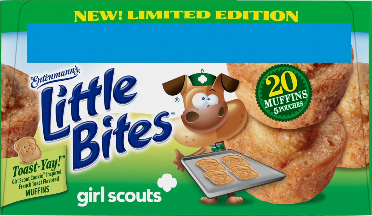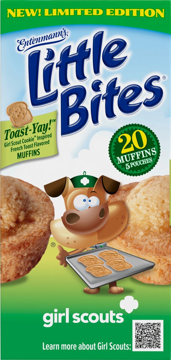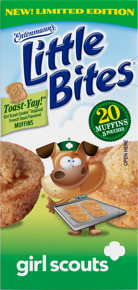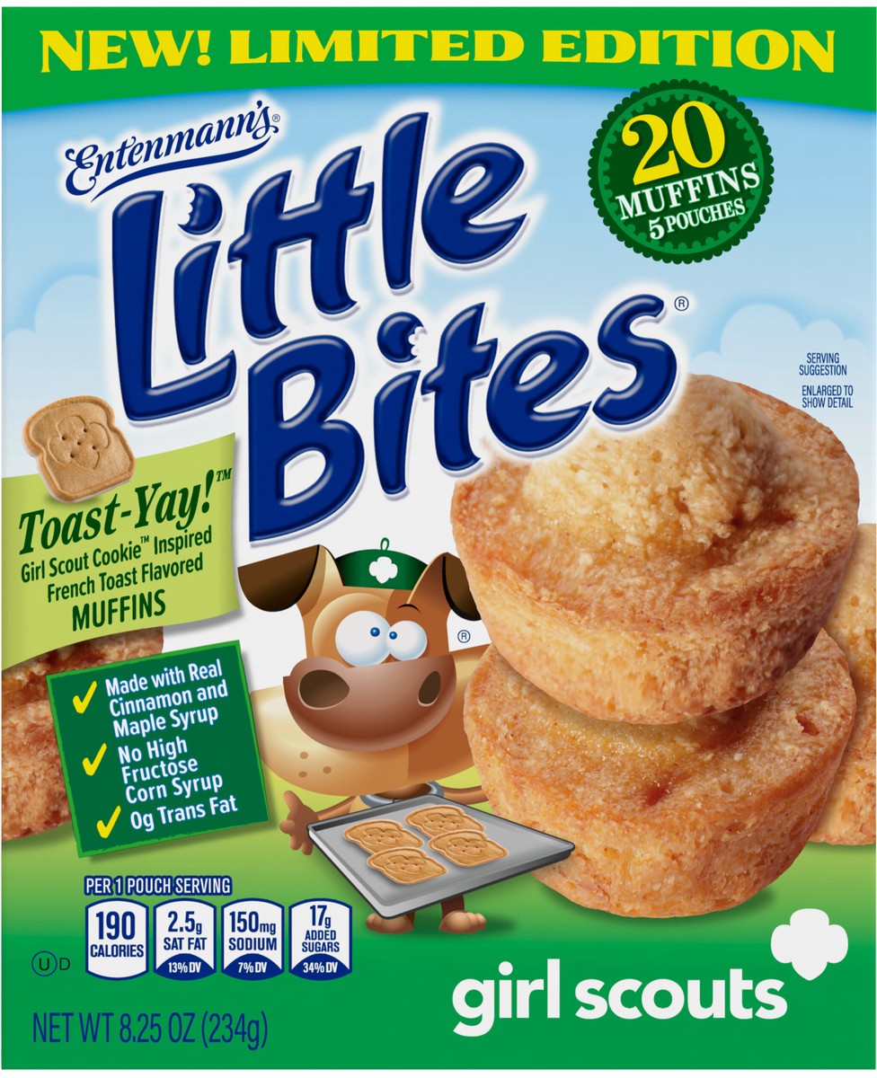 - One 8.25 oz box with five pouches of Entenmann’s Little Bites Girl Scout Toast-Yay!™ Mini MuffinsLittle Bites Girl Scout Toast-Yay!™ Mini Muffins are a delicious dessert