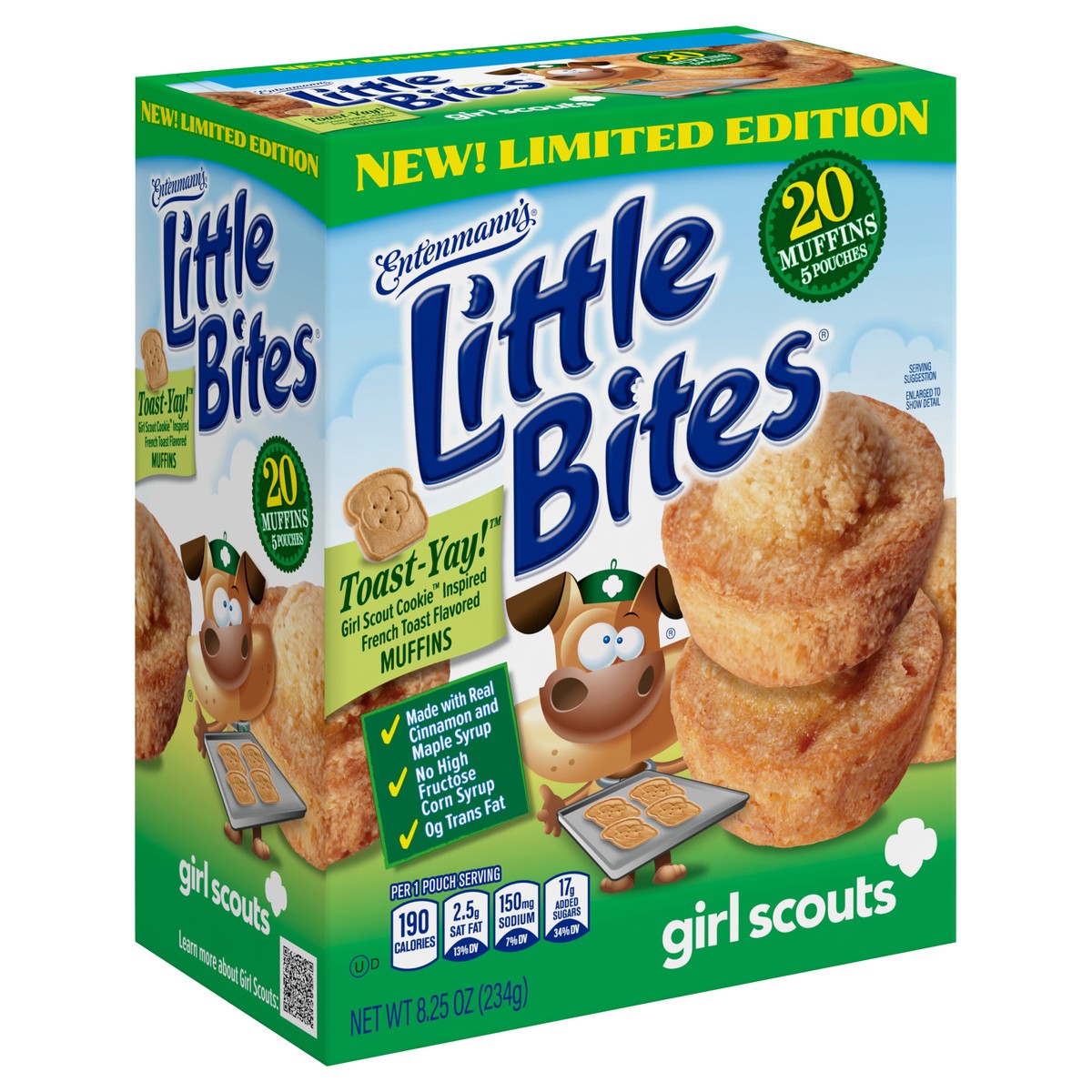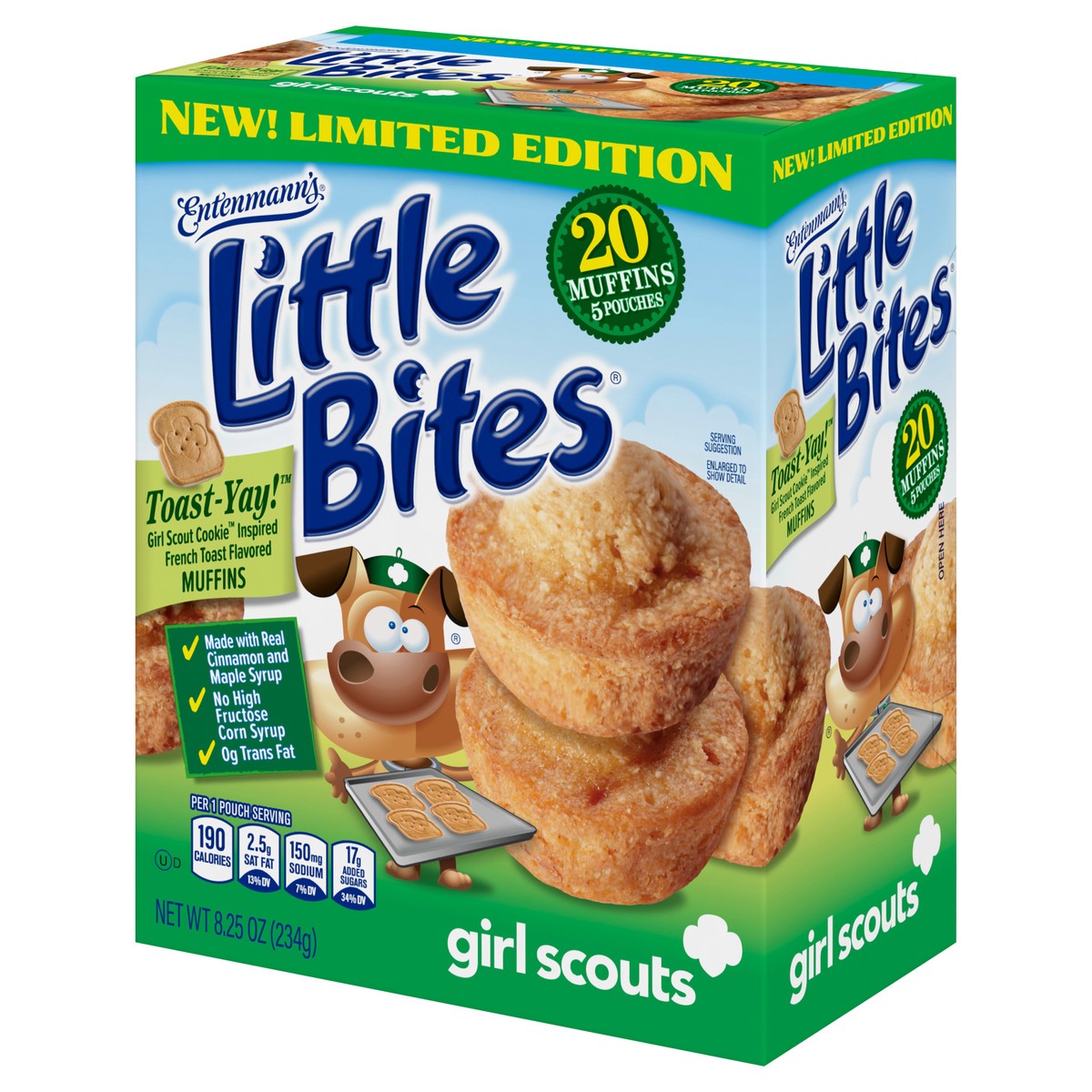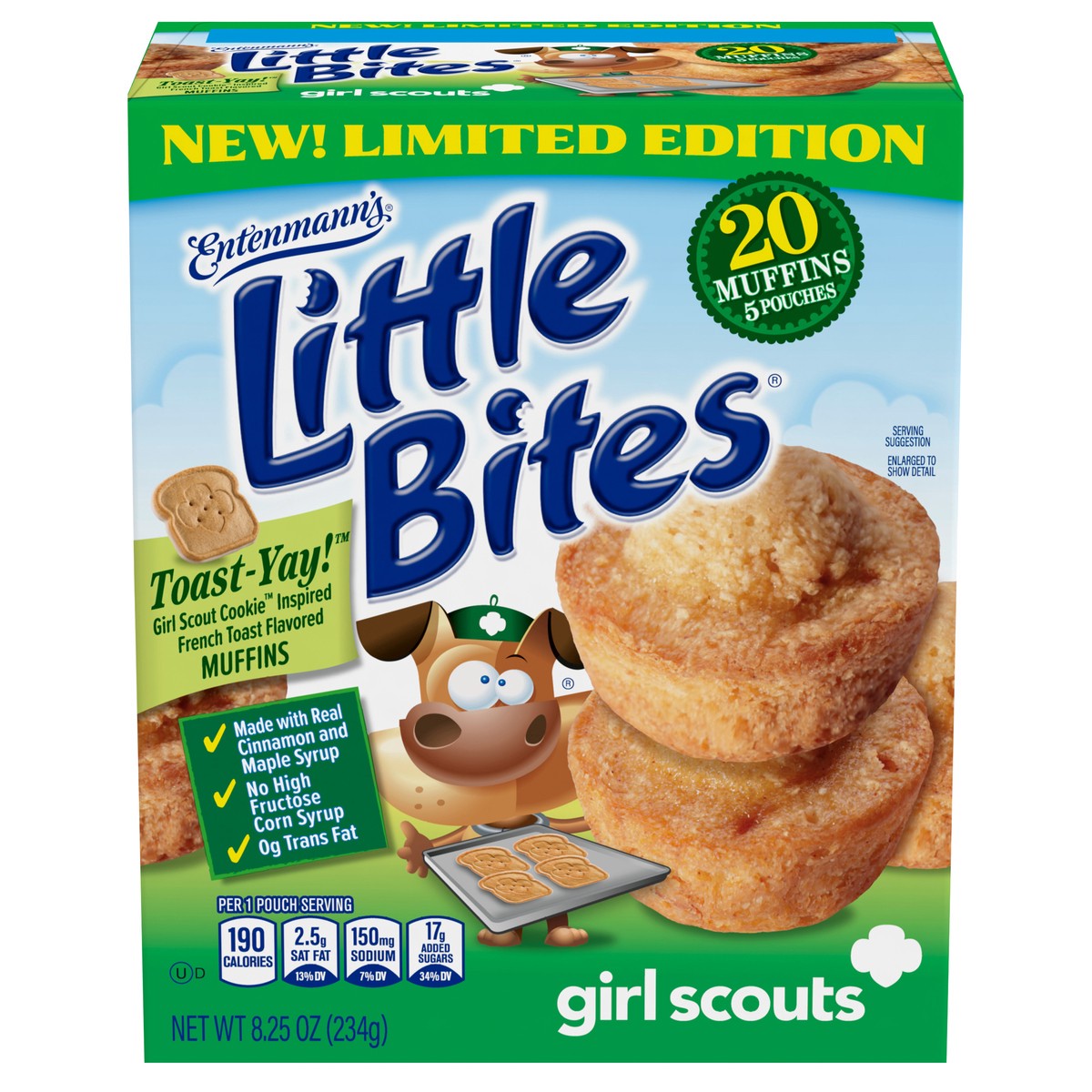 - One 8.25 oz box with five pouches of Entenmann’s Little Bites Girl Scout Toast-Yay!™ Mini MuffinsLittle Bites Girl Scout Toast-Yay!™ Mini Muffins are a delicious dessert