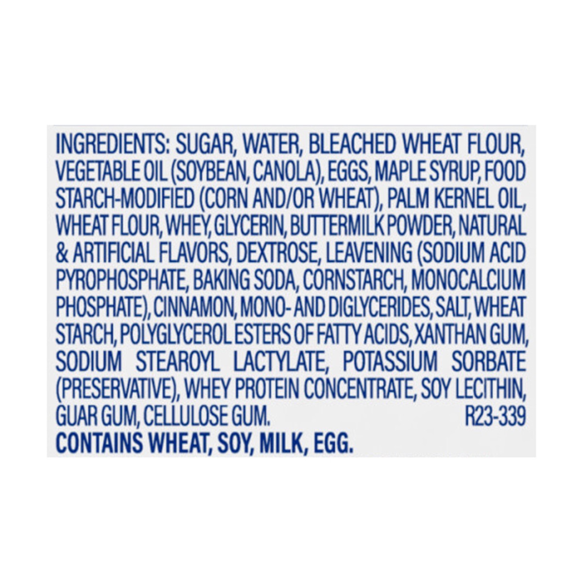 Sugar, Water, Bleached Wheat Flour, Vegetable Oil (Soybean, Canola), Eggs, Maple Syrup, Food Starch-Modified (Corn and/or Wheat), Palm Kernel Oil, Wheat Flour, Whey, Glycerin, Buttermilk Powder, Natur…