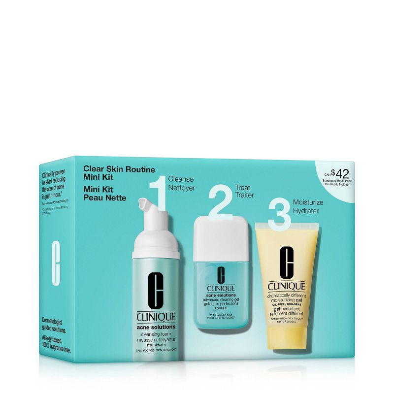 SET NAME: Clear Skin Routine Mini KitProduct Details● Step 1: Cleanse. Acne Solutions™ Cleansing Foam is a daily medicated cleanser powered by 1.5% salicylic acid that helps unclog pores.● Step 2: Tre…
