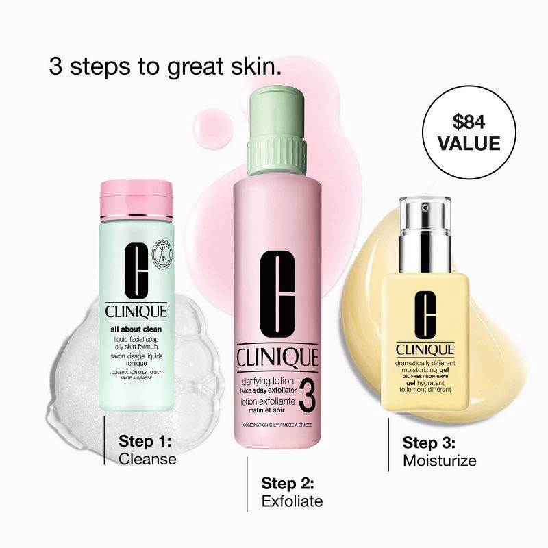 - Includes Clinique's iconic 3-step skincare system: cleanse with Facial Soap, exfoliate with Clarifying Lotion, moisturize with Dramatically Different™ Moisturizing Gel.