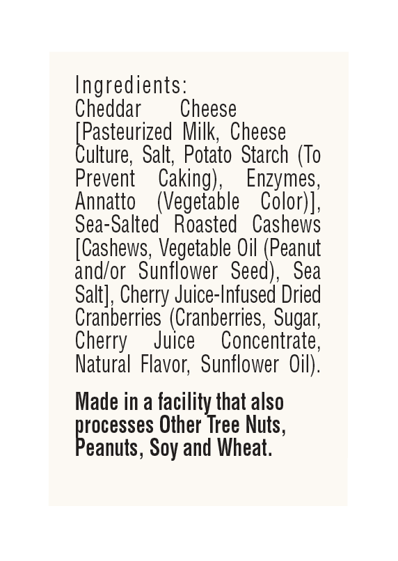 Cheddar Cheese [Pasteurized Milk, Cheese Culture, Salt, Potato Starch (To Prevent Caking), Enzymes, Annatto (Vegetable Color), Natamycin (A Natural Mold Inhibitor)], Dried Fruit and Nut Blend [Cashews…