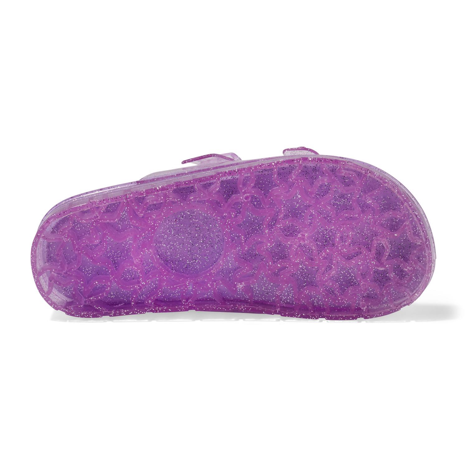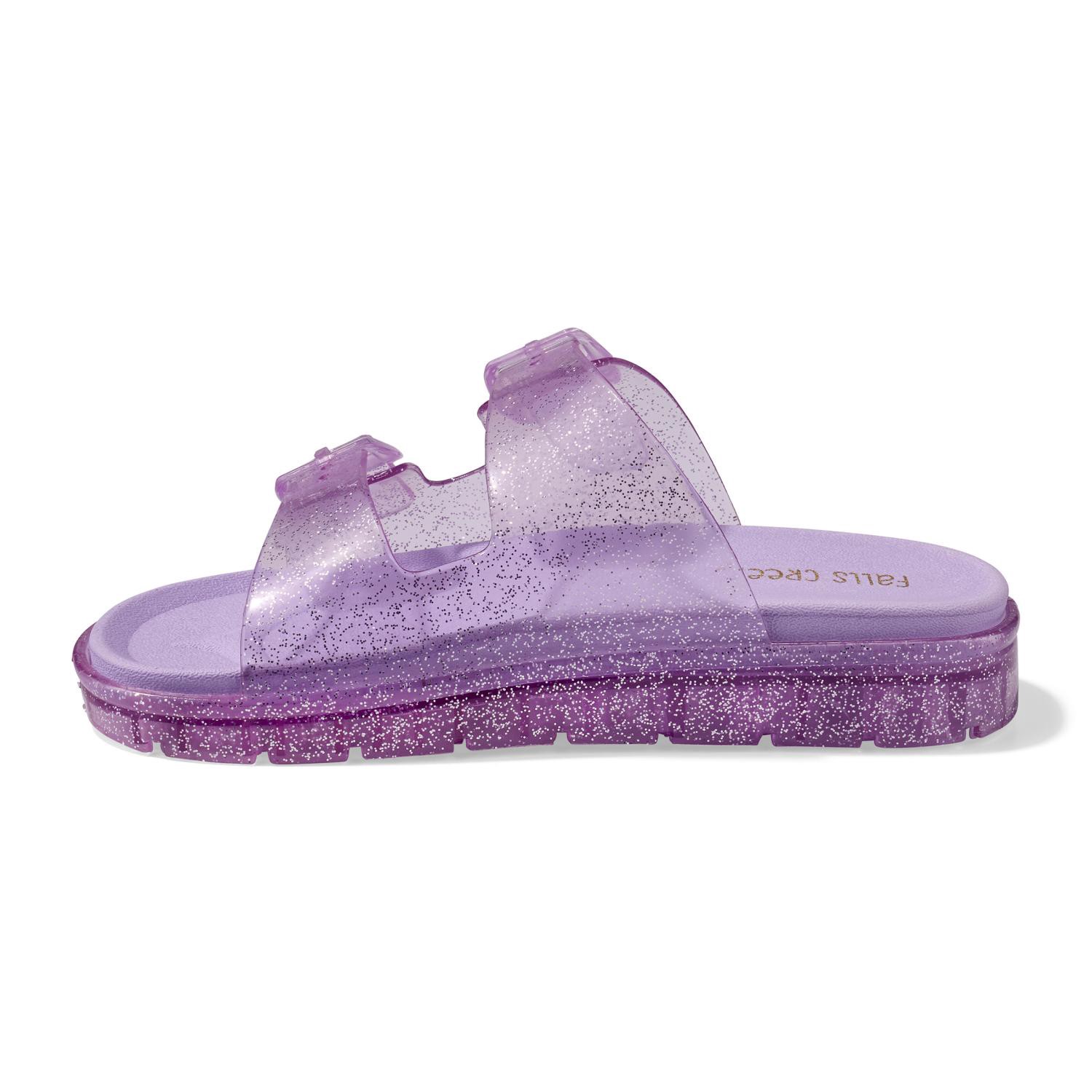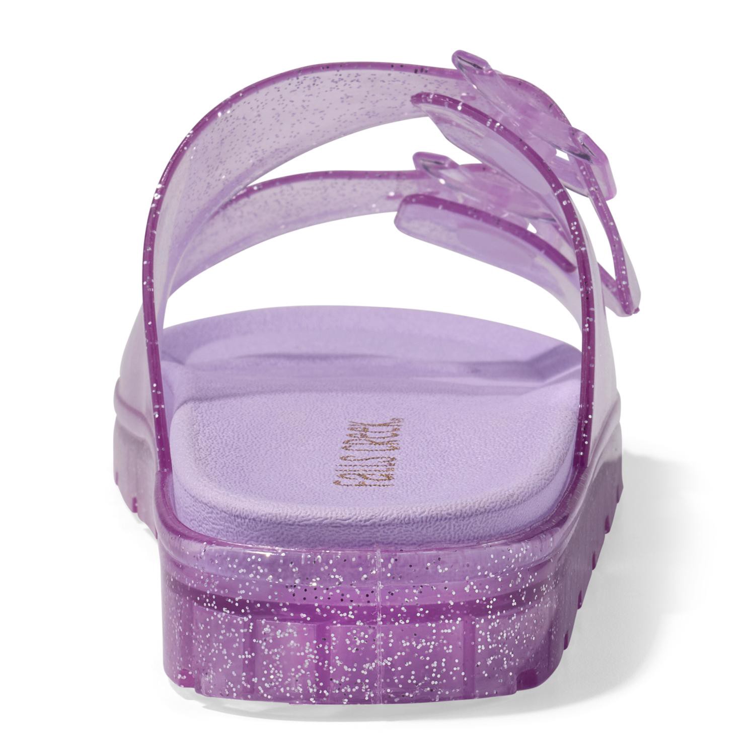 Purple Glitter Jelly buckled slide sandals add that unexpected shine to any outfit. Shiny silver glitter throughout purple PVC, two wide straps with buckles for a comfortable fit.