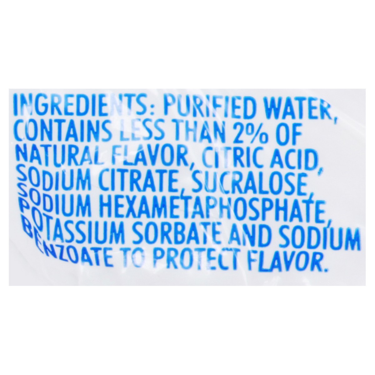 Purified Water, Contain Less than 2% of Natural Flavor, Citric Acid, Sodium Citrate, Sucralose, Sodium Hexametaphosphate, Potassium Sorbate and Sodium Benzoate to Protect Flavor.