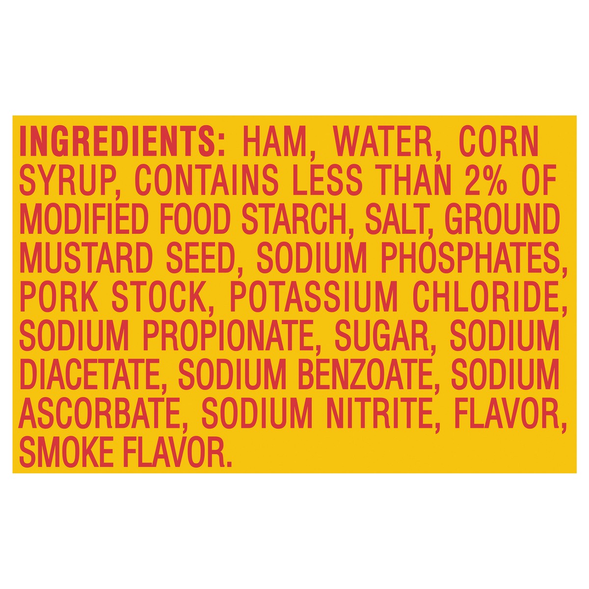 HAM, WATER, CORN SYRUP, CONTAINS LESS THAN 2% OF MODIFIED FOOD STARCH, SALT, GROUND MUSTARD SEED, SODIUM PHOSPHATES, SODIUM PROPIONATE, SUGAR, SODIUM DIACETATE, SODIUM BENZOATE, SODIUM ASCORBATE, SODI…