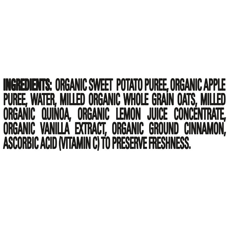 Organic Sweet Potato Puree, Organic Apple Puree, Water, Milled Organic Whole Grain Oats, Milled Organic Quinoa, Organic Lemon Juice Concentrate, Organic Vanilla Extract, Organic Ground Cinnamon, Ascor…
