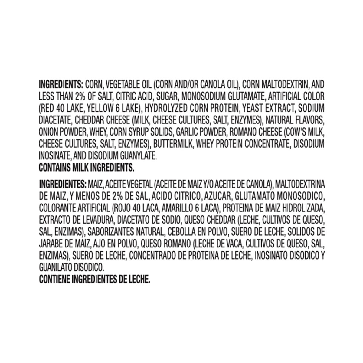 Corn, Vegetable Oil (Corn and/or Canola Oil), Corn Maltodextrin, and Less than 2% of Salt, Citric Acid, Sugar, Monosodium Glutamate, Artificial Color (Red 40 Lake, Yellow 6 Lake), Hydrolyzed Corn Prot…
