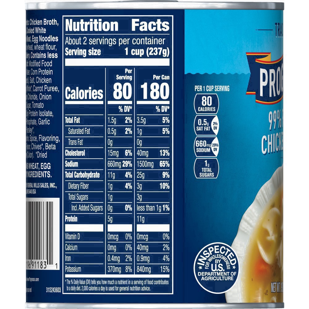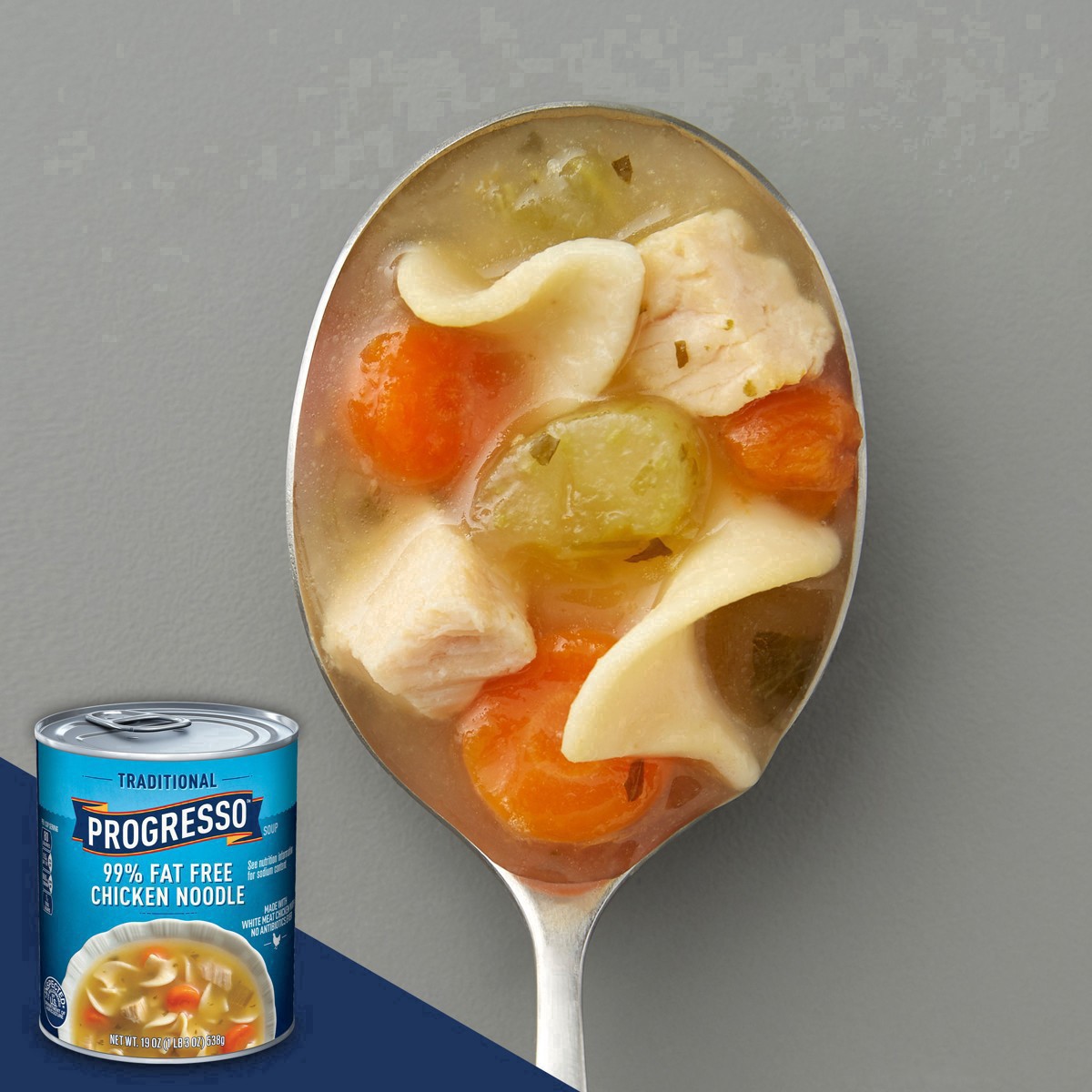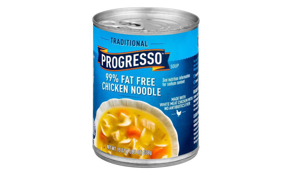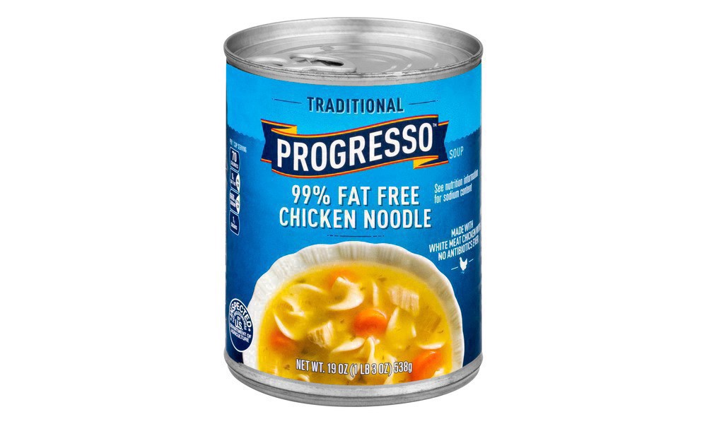 Savor every spoonful of a delicious chicken noodle soup that is low fat*. Progresso 99% Fat Free* Chicken Noodle Soup is full of tasty egg noodles, savory vegetables and chicken. This microwavable sou…
