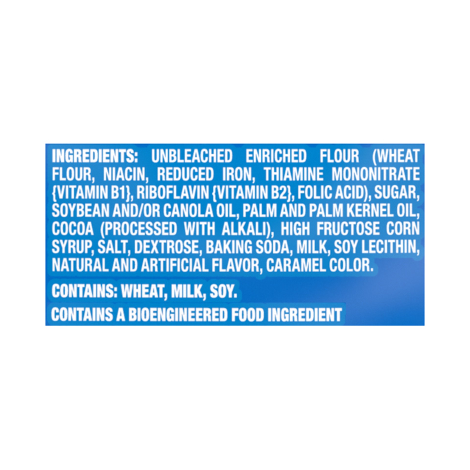 Unbleached Enriched Flour (Wheat Flour, Niacin, Reduced Iron, Thiamine Mononitrate {Vitamin B1}, Riboflavin {Vitamin B2}, Folic Acid), Sugar, Soybean and/or Canola Oil, Palm and Palm Kernel Oil, Cocoa…