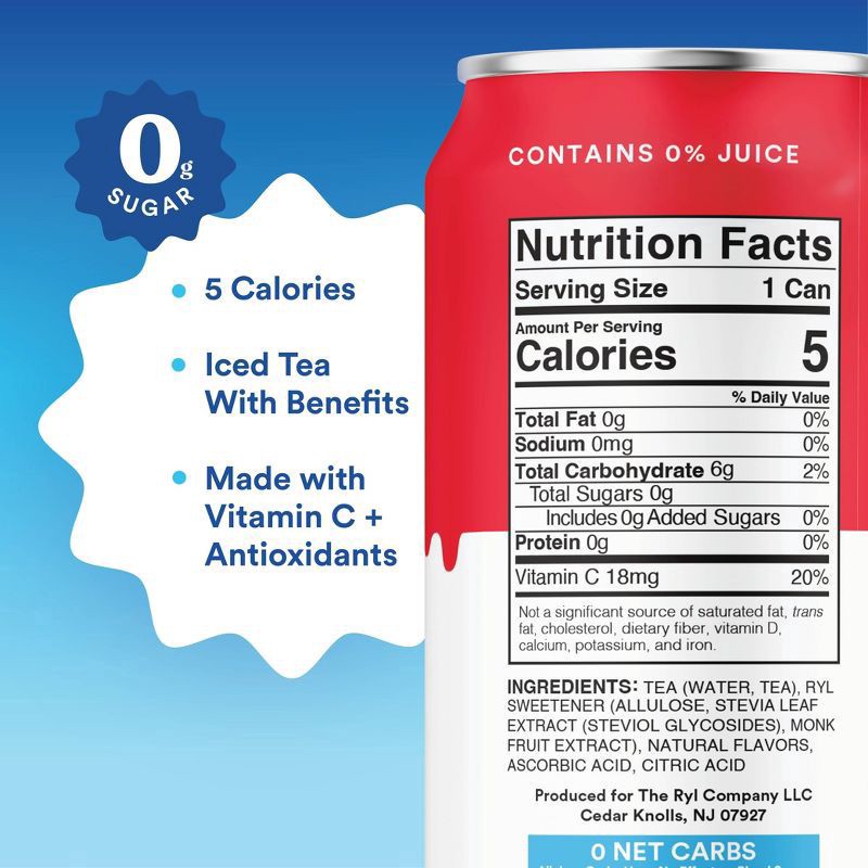 Tea (Water, Tea), RYL SWEETENER (ALLULOSE, STEVIA LEAF EXTRACT (STEVIAL GLYCOSIDES), MONK FRUIT EXTRACT), NATURAL FLAVORS, ASCORBIC ACID, CITRIC ACID