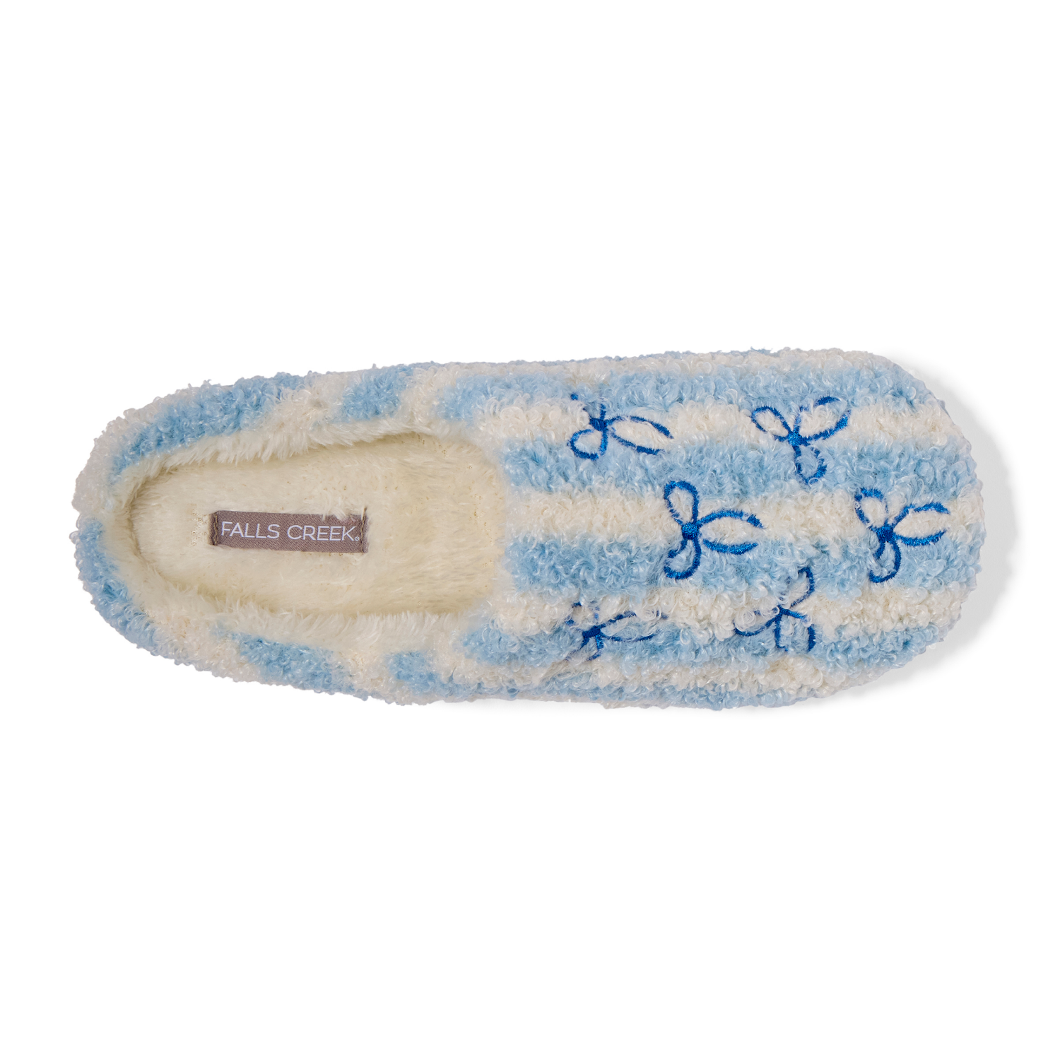The Falls Creek Blue Bow Stripe Slipper brings cozy comfort and timeless style to your everyday routine. Featuring a soft sherpa upper with blue-and-white stripes and dainty bow prints, this slipper d…