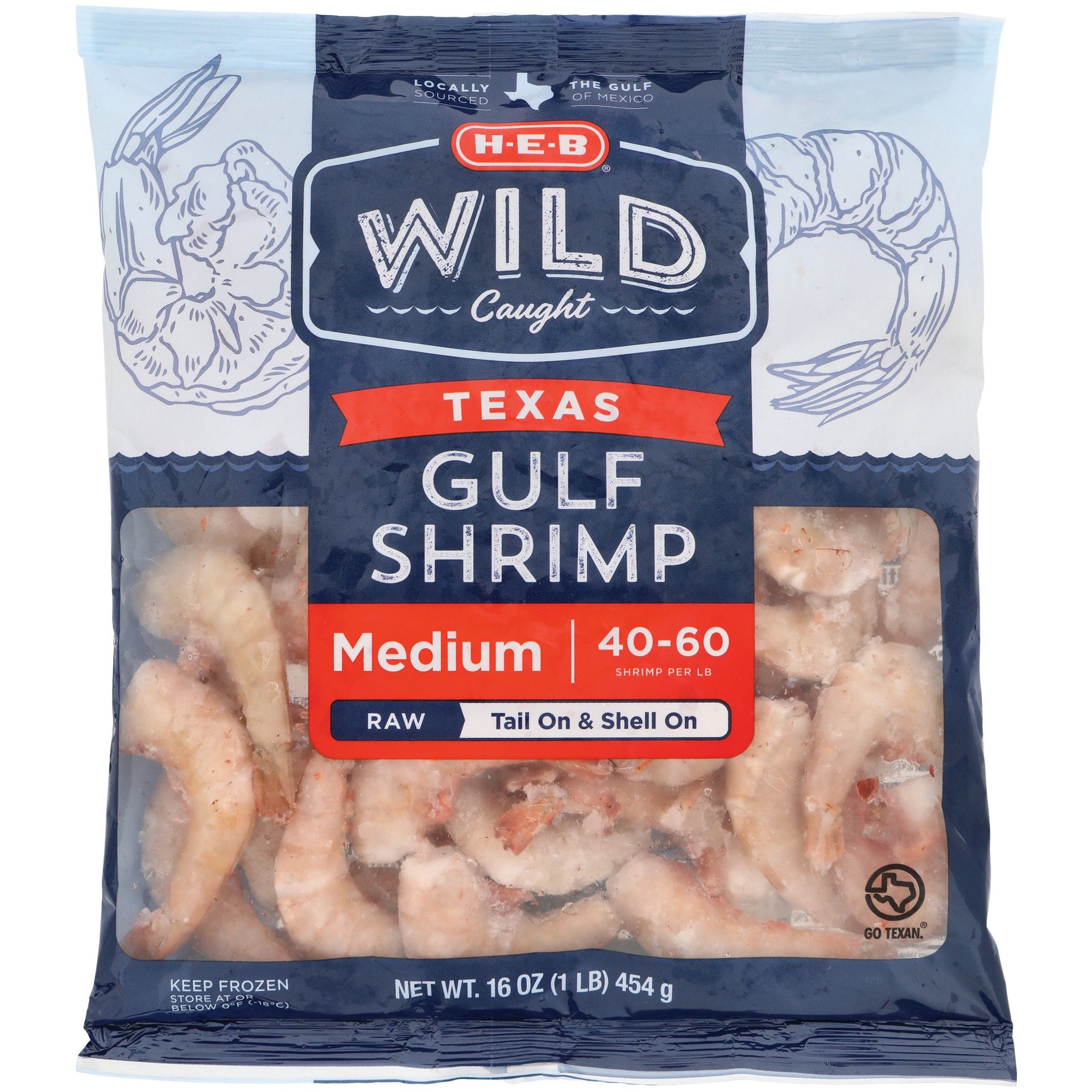 H-E-B Wild Caught Frozen Shell-On Tail-On Medium Texas Gulf Raw Shrimp, 40 - 60 ct/lb