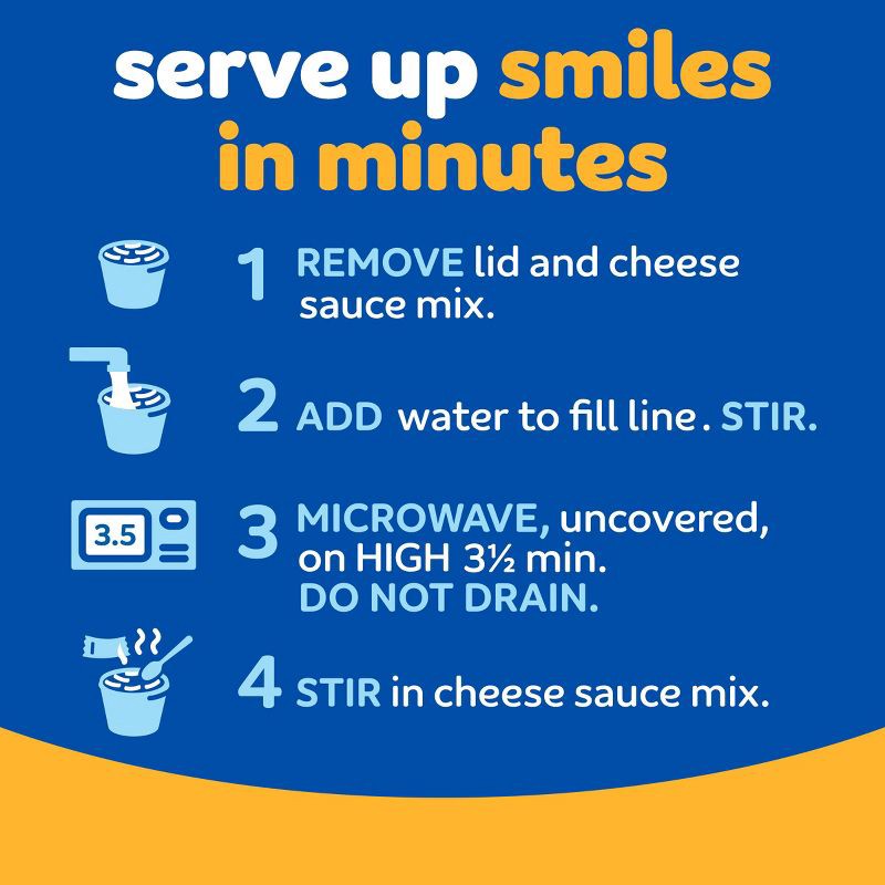 - MICROWAVE MAC AND CHEESE: Shelf-stable easy mac and cheese cups are convenient to keep on hand for snacks, easy meals and family dinners