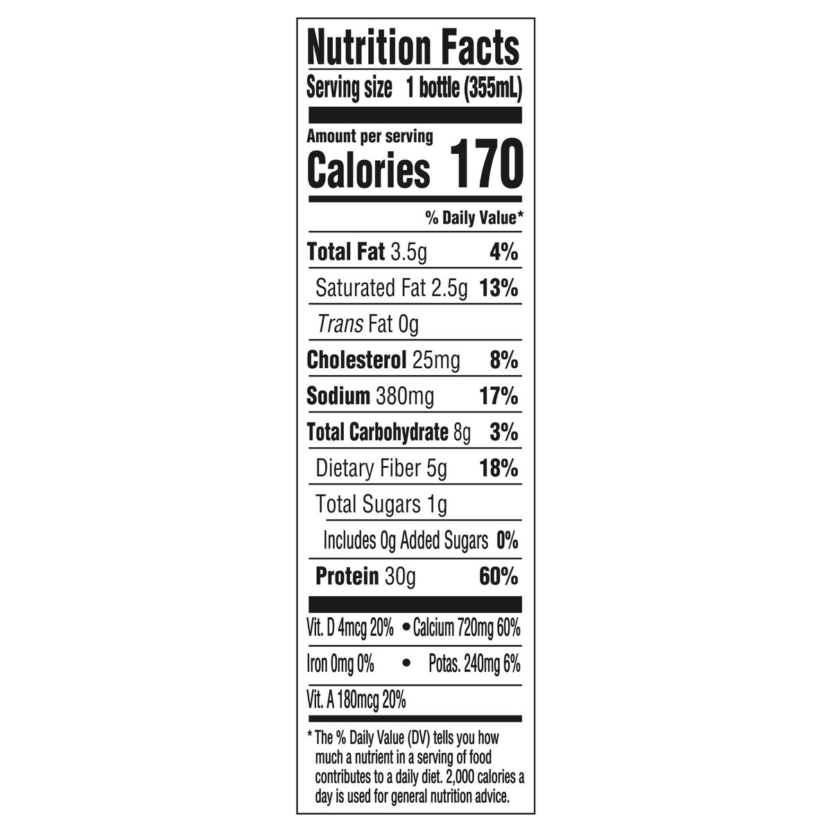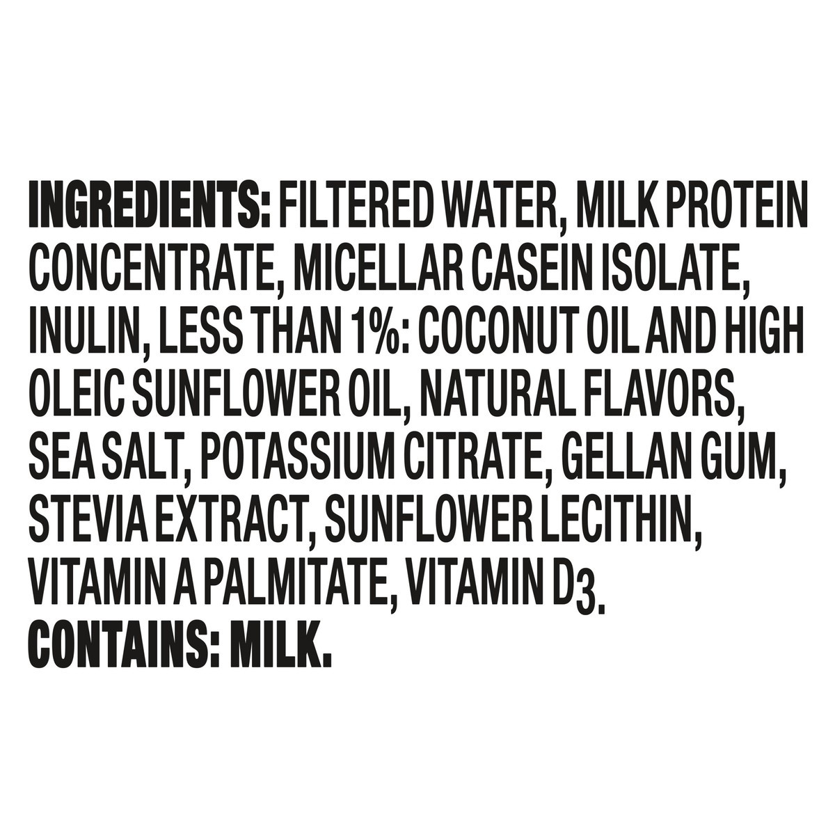 Filtered Water, Milk Protein Concentrate, Micellar Casein Isolate, Inulin, Less than 1%: Coconut Oil and High Oleic Sunflower Oil, Natural Flavors, Sea Salt, Potassium Citrate, Gellan Gum, Stevia Extr…