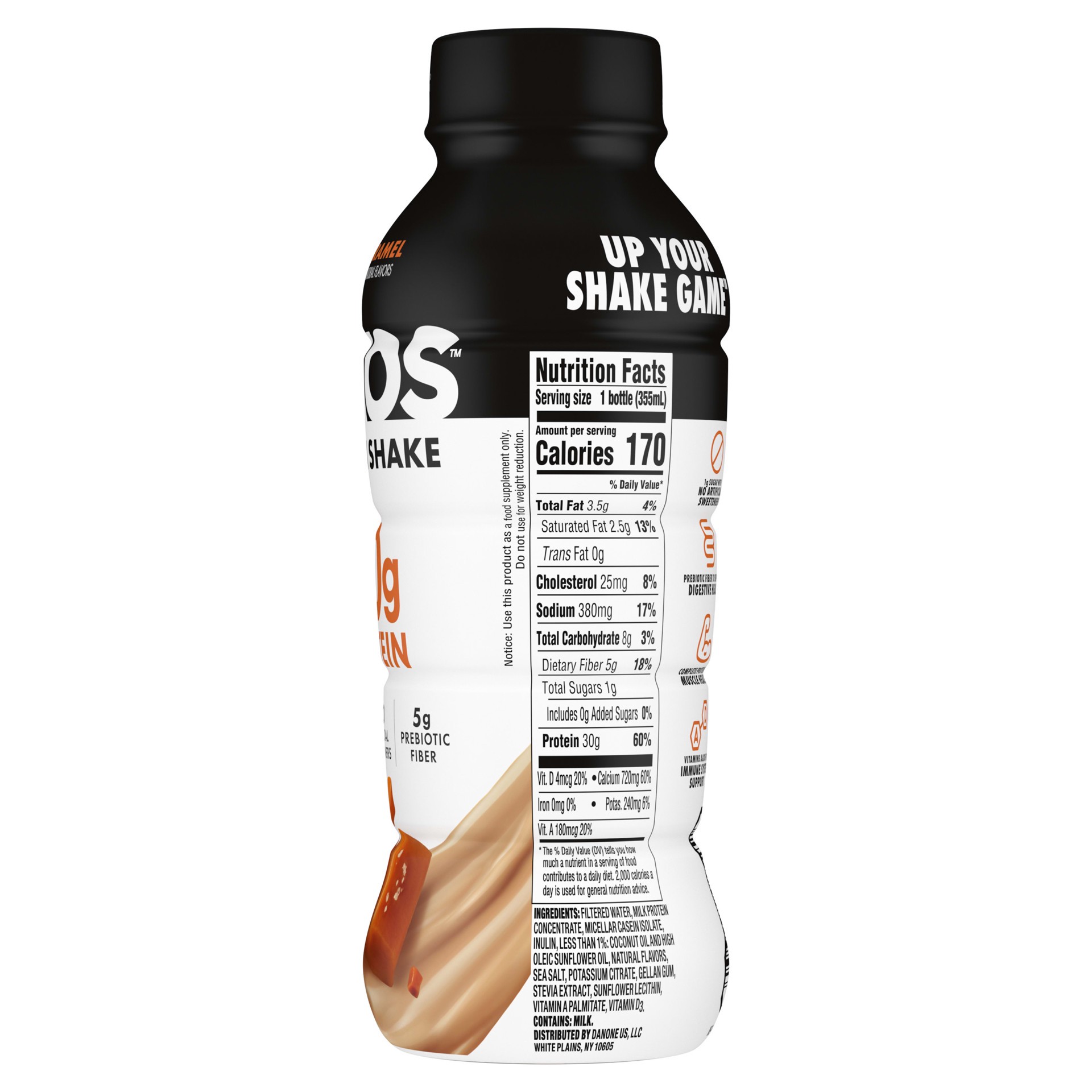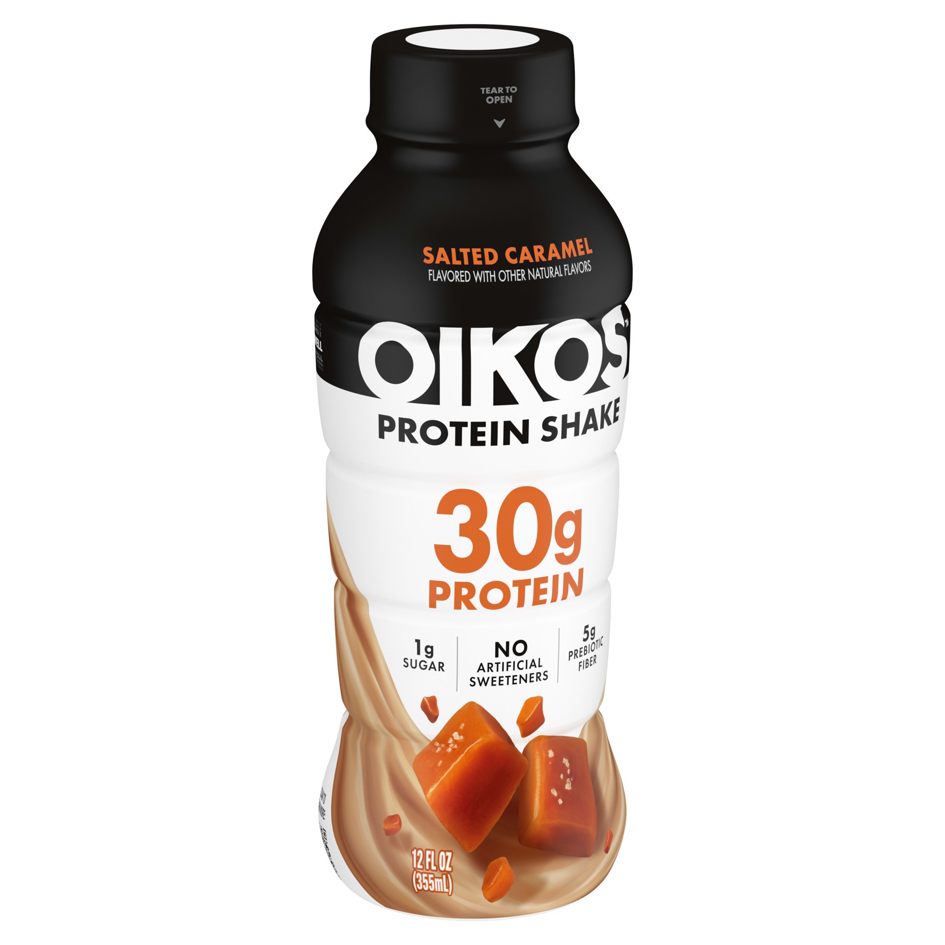 - Stronger Makes Everything Better: One 12 fl oz bottle of Oikos Salted Caramel Protein ShakeUnstoppably Delicious: Delicious Oikos high protein shakes bring a bold salted caramel flavor and 30g of complete protein per serving for muscle supportFull of Nutrition: Salted Caramel protein shake contains key vitamins A and D for immune system support and 5g prebiotic fiber to support digestive health*Up Your Shake Game (TM): These delicious high protein drinks contain 1g of sugar per serving