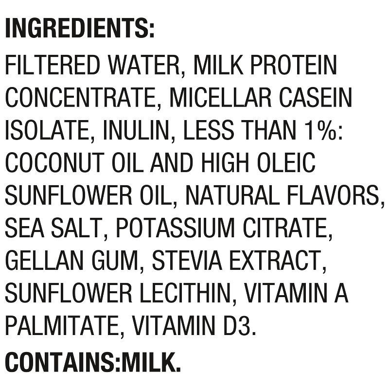 FILTERED WATER, MILK PROTEIN CONCENTRATE, MICELLAR CASEIN ISOLATE, INULIN, LESS THAN 1%, COCONUT OIL AND HIGH OLEIC SUNFLOWER OIL, NATURAL FLAVORS, SEA SALT, POTASSIUM CITRATE, GELLAN GUM, STEVIA EXTR…