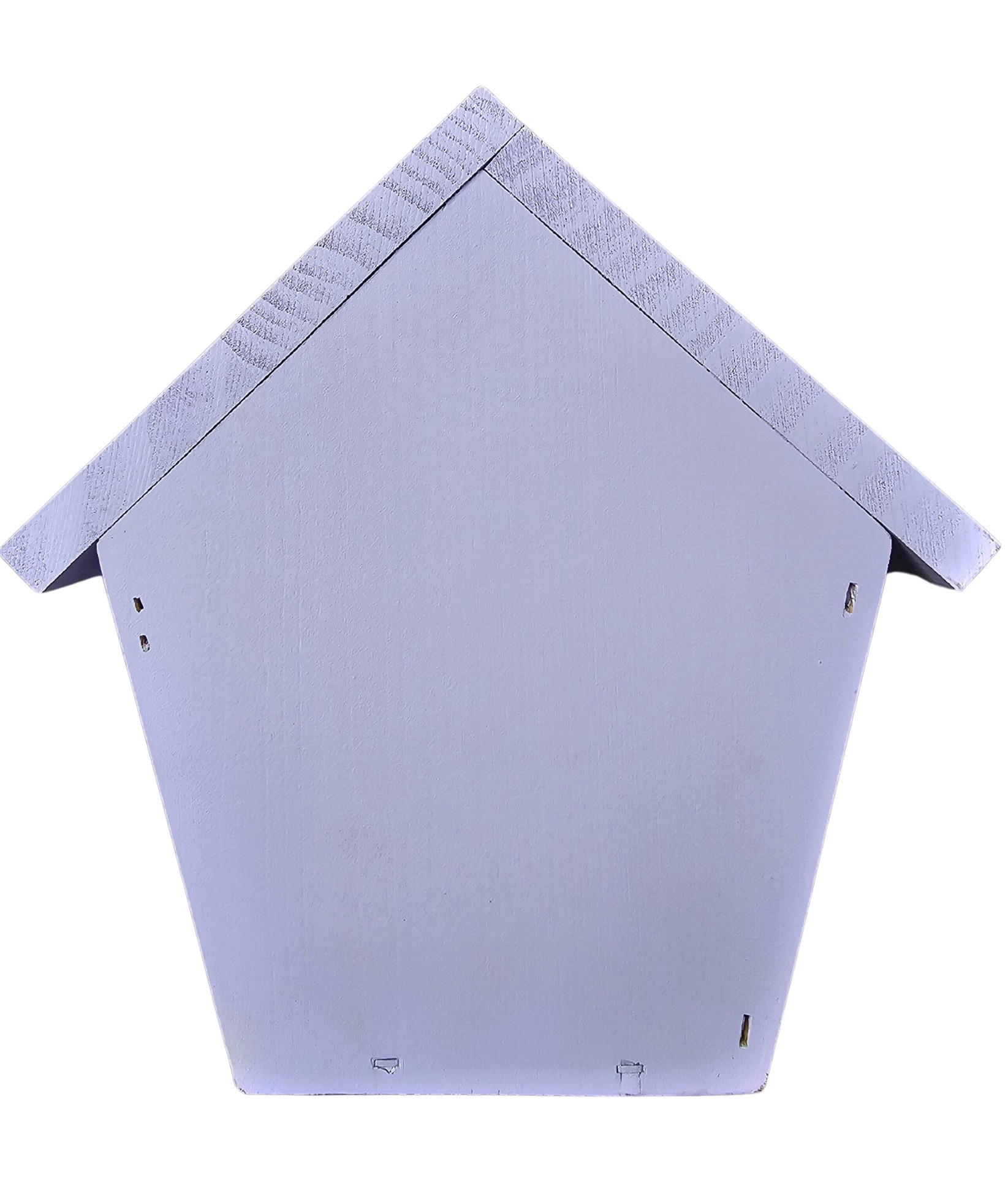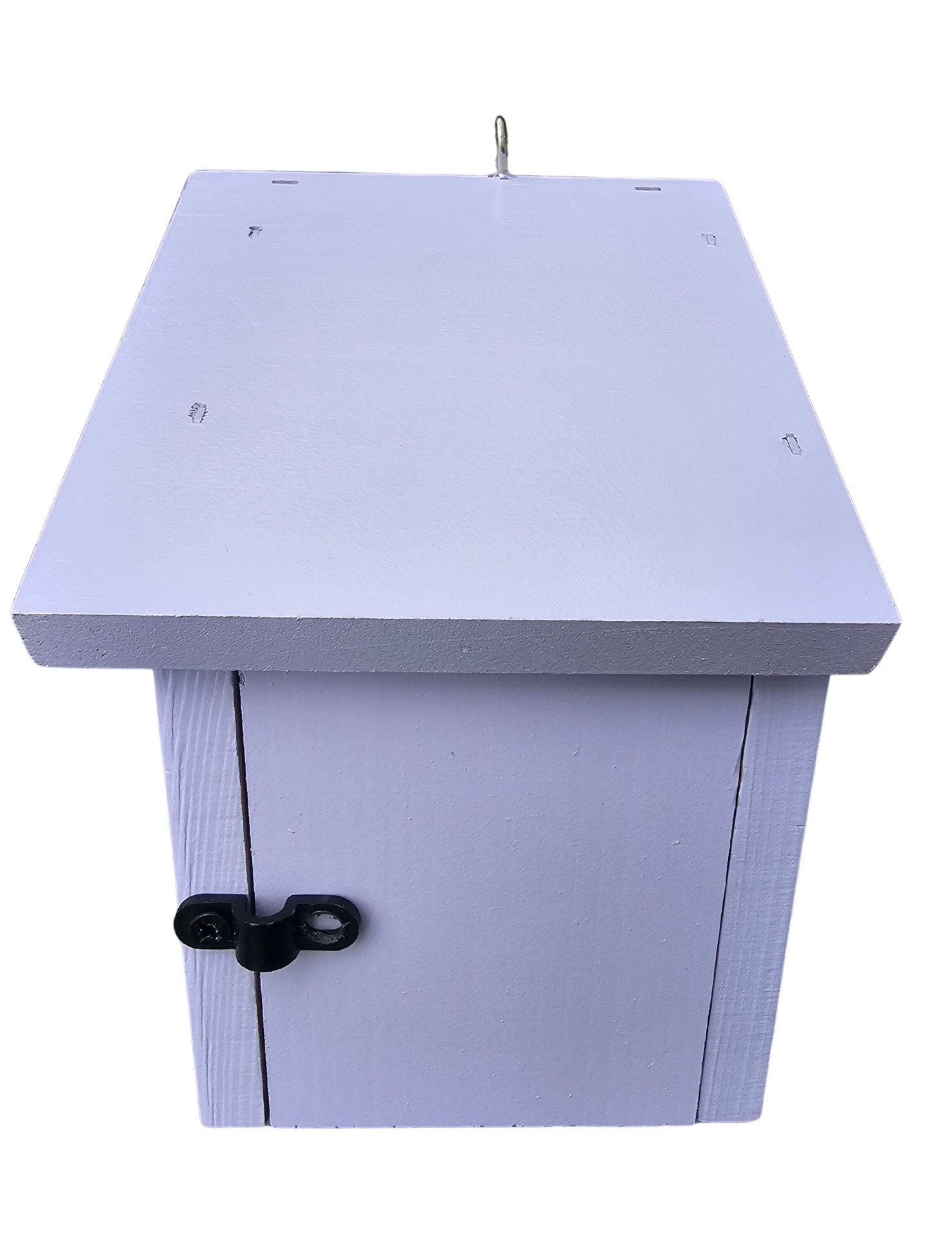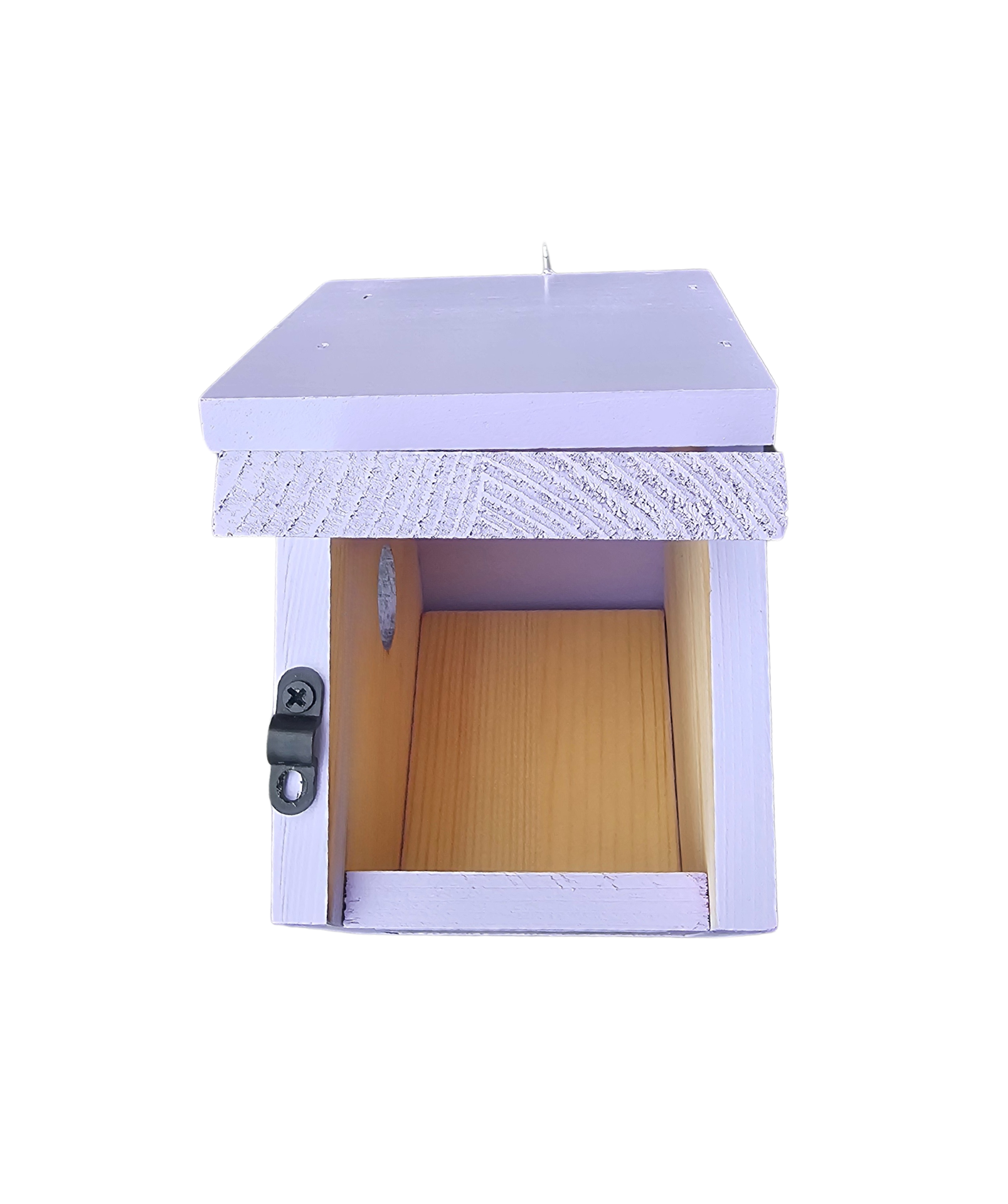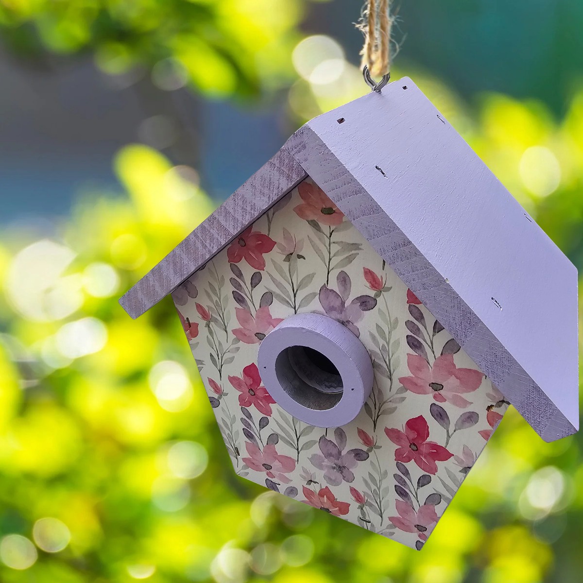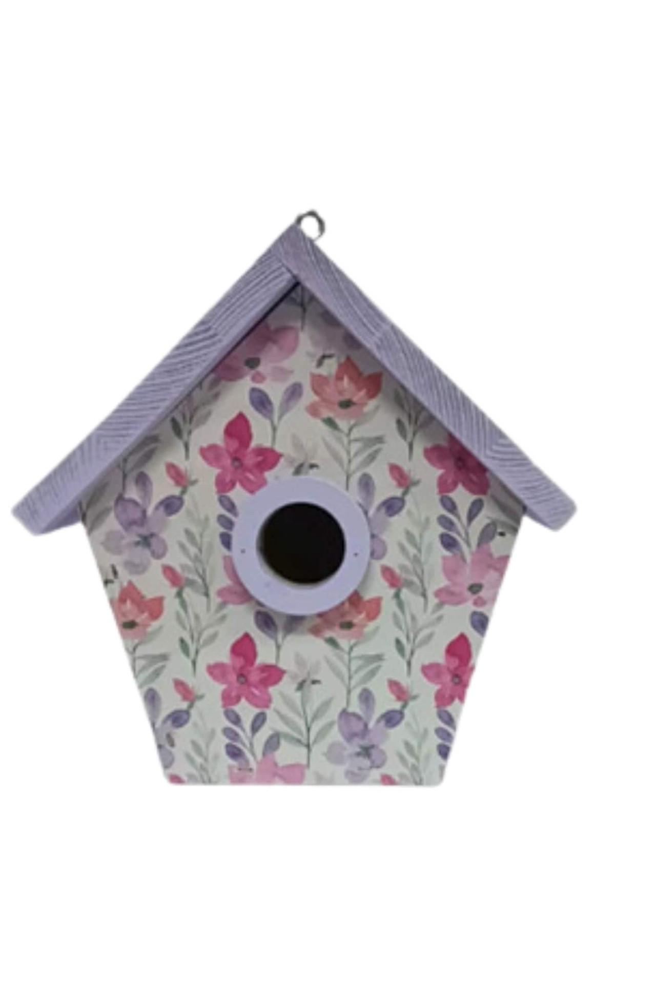 Painted pine wood with floral print. Side door opening for easy clean out. Built in ventilation. Includes built in wooden predator guard. Eye hook attached to roof for easy hanging.