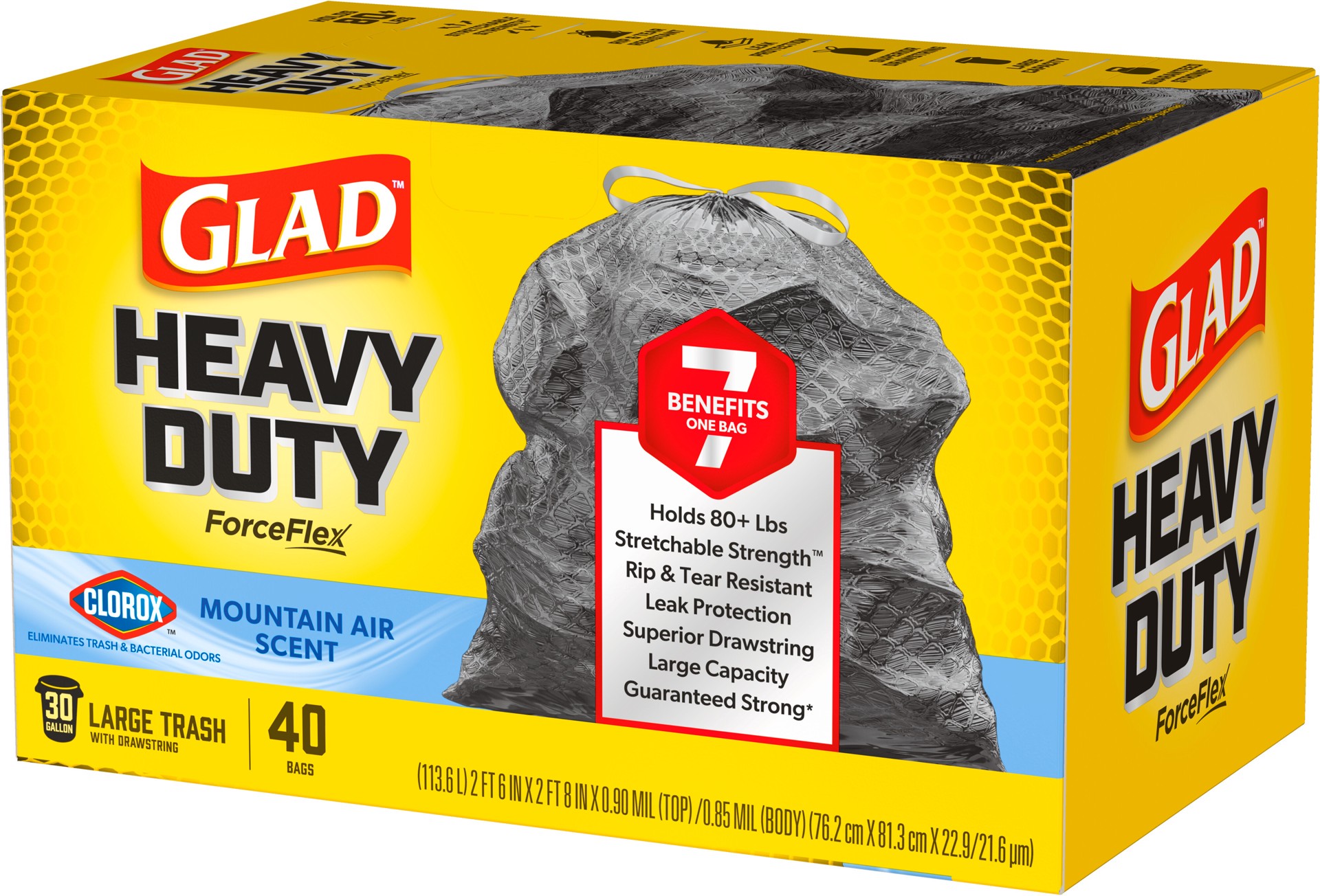 Glad ForceFlex Heavy Duty Trash Bags harness the power of Clorox to eliminate trash and bacterial odors with a fresh Mountain Air scent, making them an ideal solution for all your toughest cleanup job…
