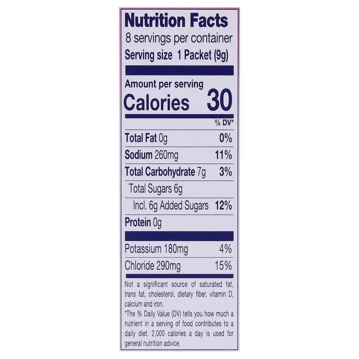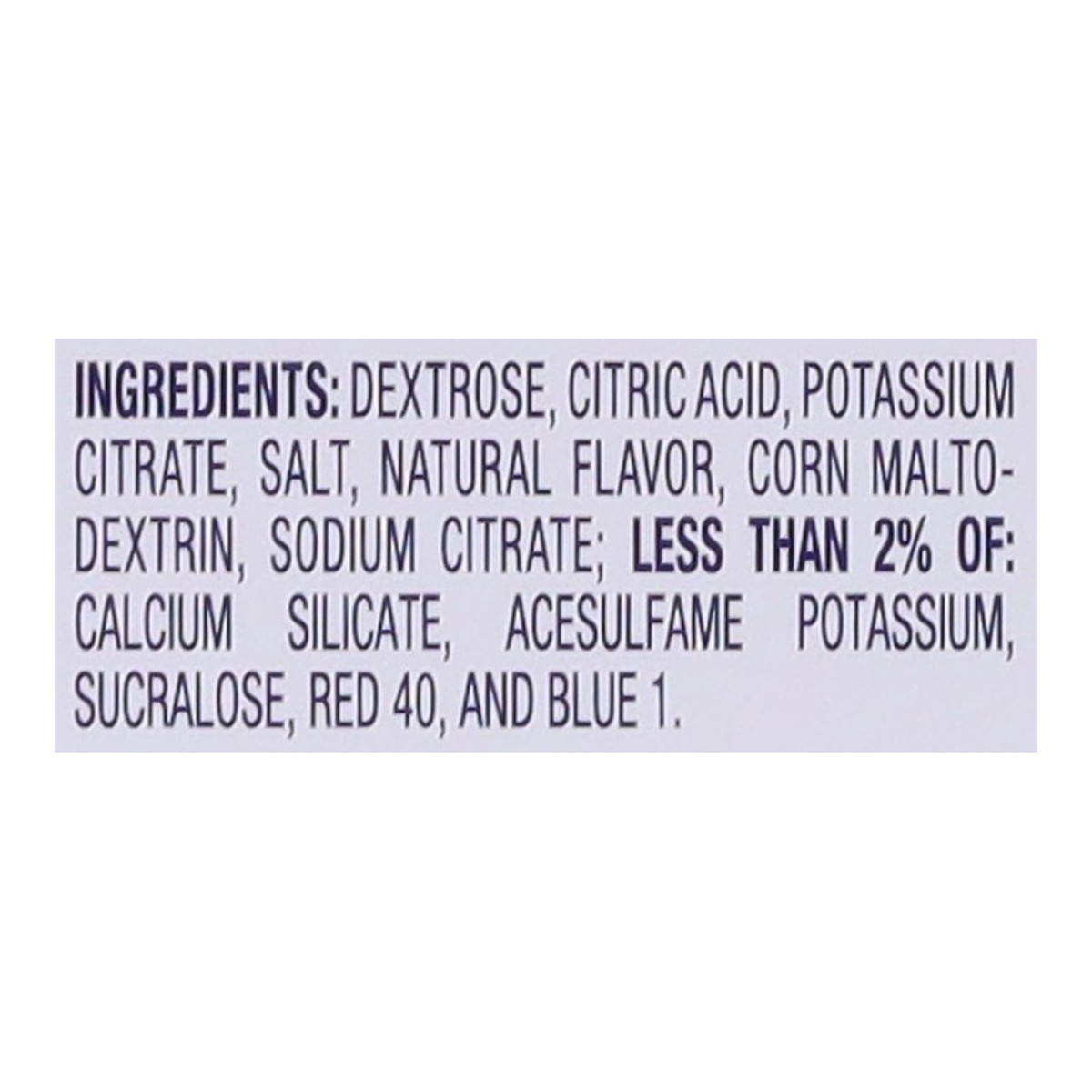Dextrose, Citric Acid, Potassium Citrate, Salt, Natural Flavor, Corn Maltodextrin, Sodium Citrate; Less than 2% of: Calcium Silicate, Acesulfame Potassium, Sucralose, Red 40, and Blue 1.