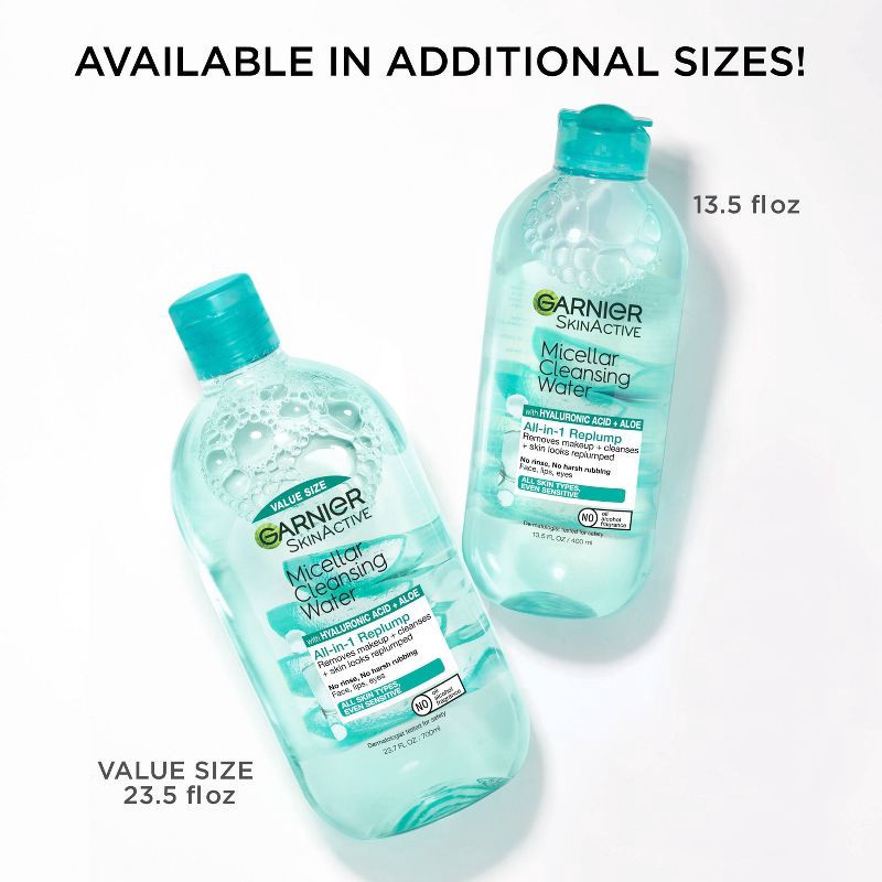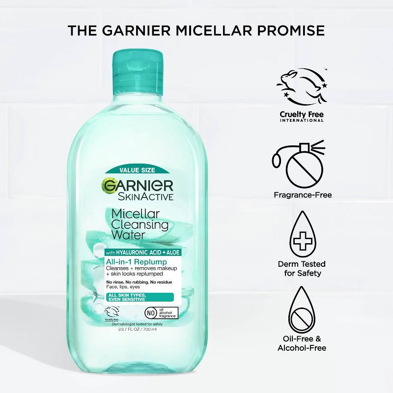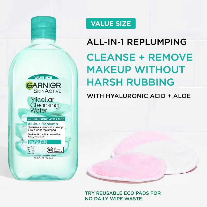 - Garnier Micellar Water with Hyaluronic Acid and Aloe Vera Facial Cleanser: Use this gentle yet powerful makeup remover to remove stubborn makeup and leave skin looking healthy and replumped; Safe for use in the eye area; leaves skin clean and refreshed, never dry