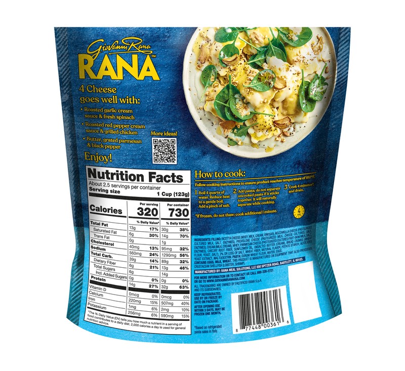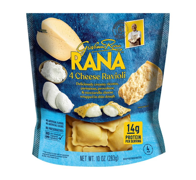 4 Cheese Ravioli. Deliciously creamy ricotta, parmesan, provolone, and mozzarella cheese wrapped in thin dough. Packed with 14 grams of protein per serving. Made with no artificial flavors, no artific…