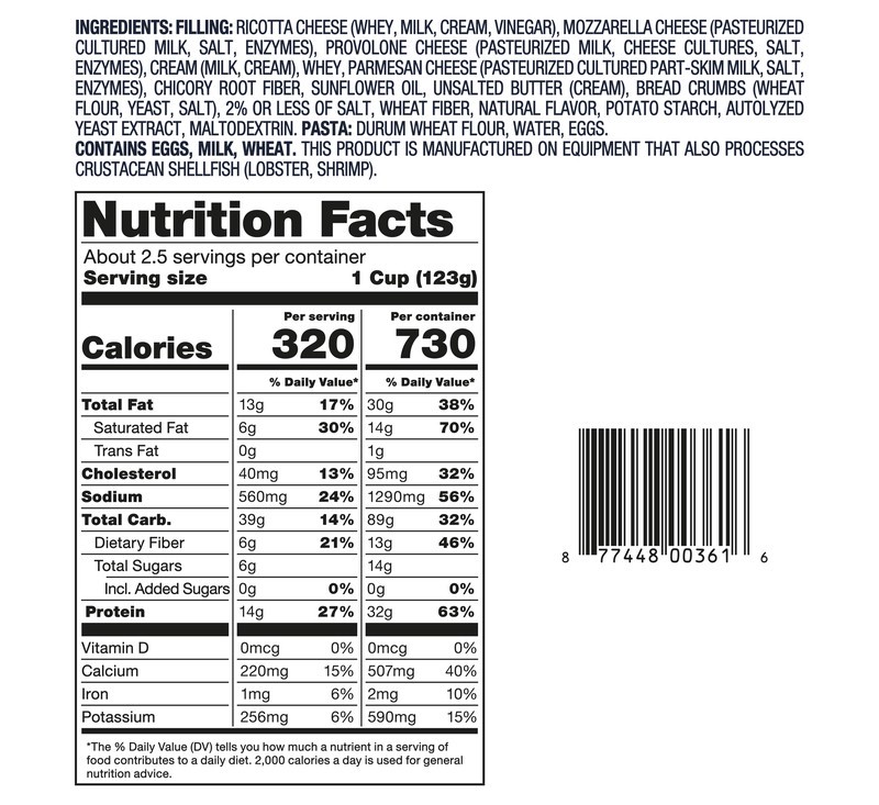 FILLING: RICOTTA CHEESE (WHEY, MILK, CREAM, VINEGAR), MOZZARELLA CHEESE (PASTEURIZED CULTURED MILK, SALT, ENZYMES), PROVOLONE CHEESE (PASTEURIZED MILK, CHEESE CULTURES, SALT, ENZYMES), HEAVY CREAM (CR…